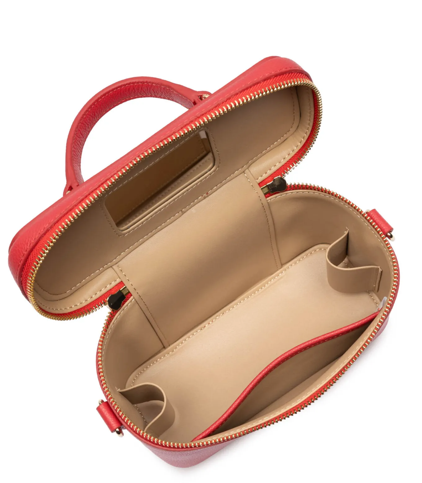 Deze vanity tas is gemaakt van kalfsleer met een korrelstructuur. Hij heeft een hoofdvak met een spiegel, een eenvoudig binnenvak en twee lippenstift houders. De tas kan met de hand, over de schouder of kruisdragend worden gedragen.