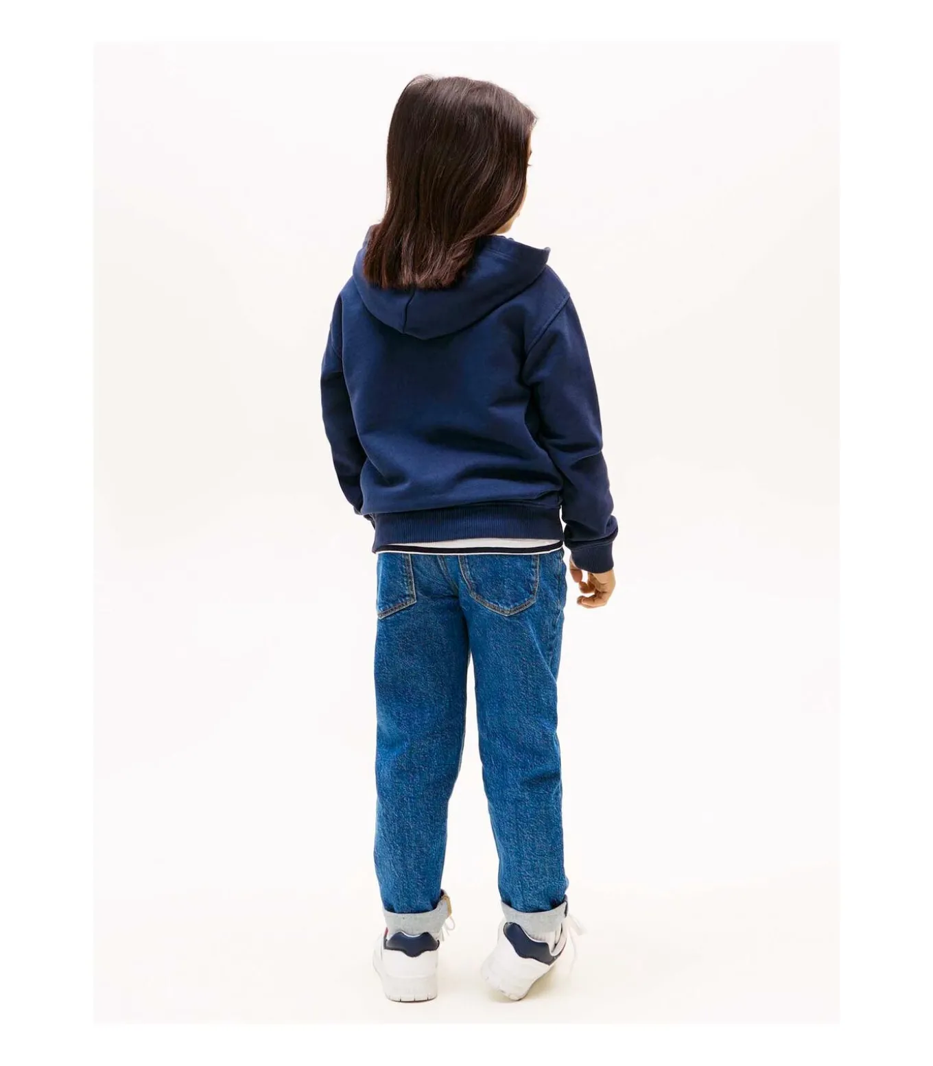 Kleur: Dark Night Navy Samenstelling: 100% katoen Mouwen: Lang Pasvorm: Normaal Sluiting: Volledige ritssluiting Details: Hoodie van puur katoen met volledige ritssluiting en split kangoeroezak. Afgewerkt met geribbelde zoom en manchetten, ton–sur–ton vlaggetjesborduursel op de borst en iconische details aan de binnenkant van de kraag. De licht verlaagde schouders maken de relaxte stijl compleet. Gebruik: Perfect voor casual en sportieve looks, ideaal voor school en vrije tijd met een vleugje Tommy–elegantie