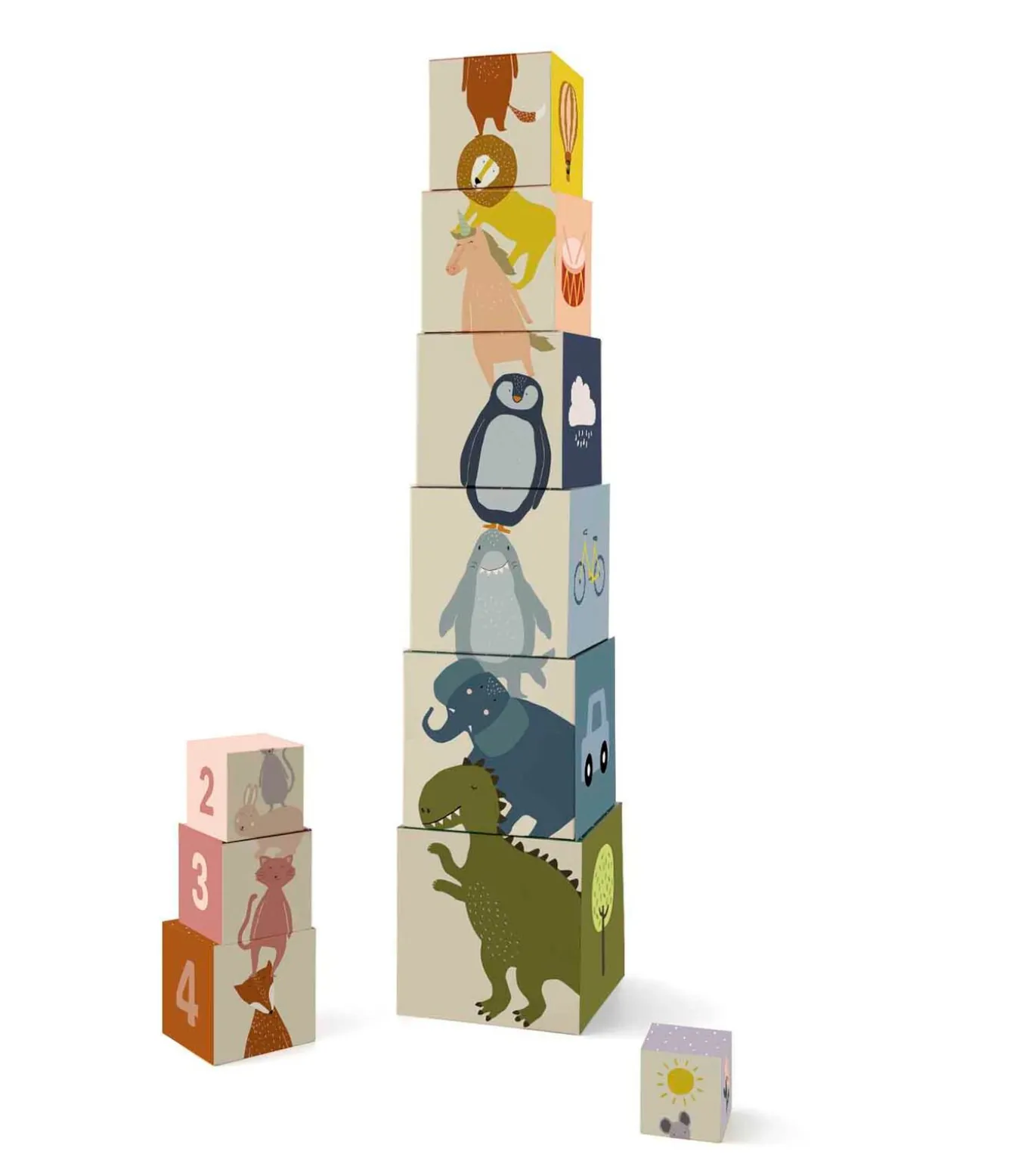 Trixie stapelblokken educatief speelgoed karton dieren kleurrijkMet deze stapelblokken van Trixie wordt spelen een echt avontuur! De kleurrijke blokken zijn gemaakt van stevig karton en zitten vol verrassingen: op elke zijde ontdek je een ander thema, van vrolijke dieren tot leuke puzzels. Zo leren kinderen spelenderwijs tellen, sorteren en voorwerpen benoemen.De set bestaat uit maar liefst 10 blokken die je kunt stapelen tot een hoge toren, of juist op grootte kunt sorteren. Dankzij het duurzame FSC–karton en de bedrukking met soya inkt zijn de blokken niet alleen leuk, maar ook milieuvriendelijk. Een absolute must–have voor nieuwsgierige kinderen die graag ontdekken!Extra informatieGemaakt van stevig FSC–karton en bedrukt met soya inktBevat 10 kleurrijke blokken met verschillende thema’sStimuleert leren, puzzelen en sorterenGeschikt voor kinderen vanaf 3 jaar
