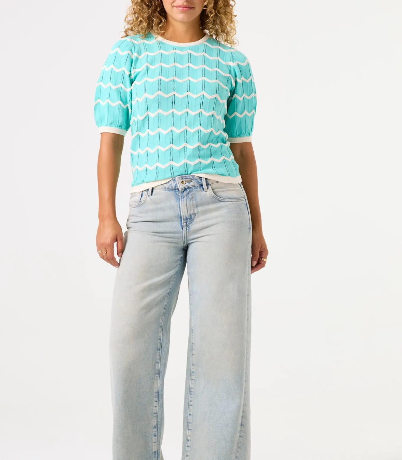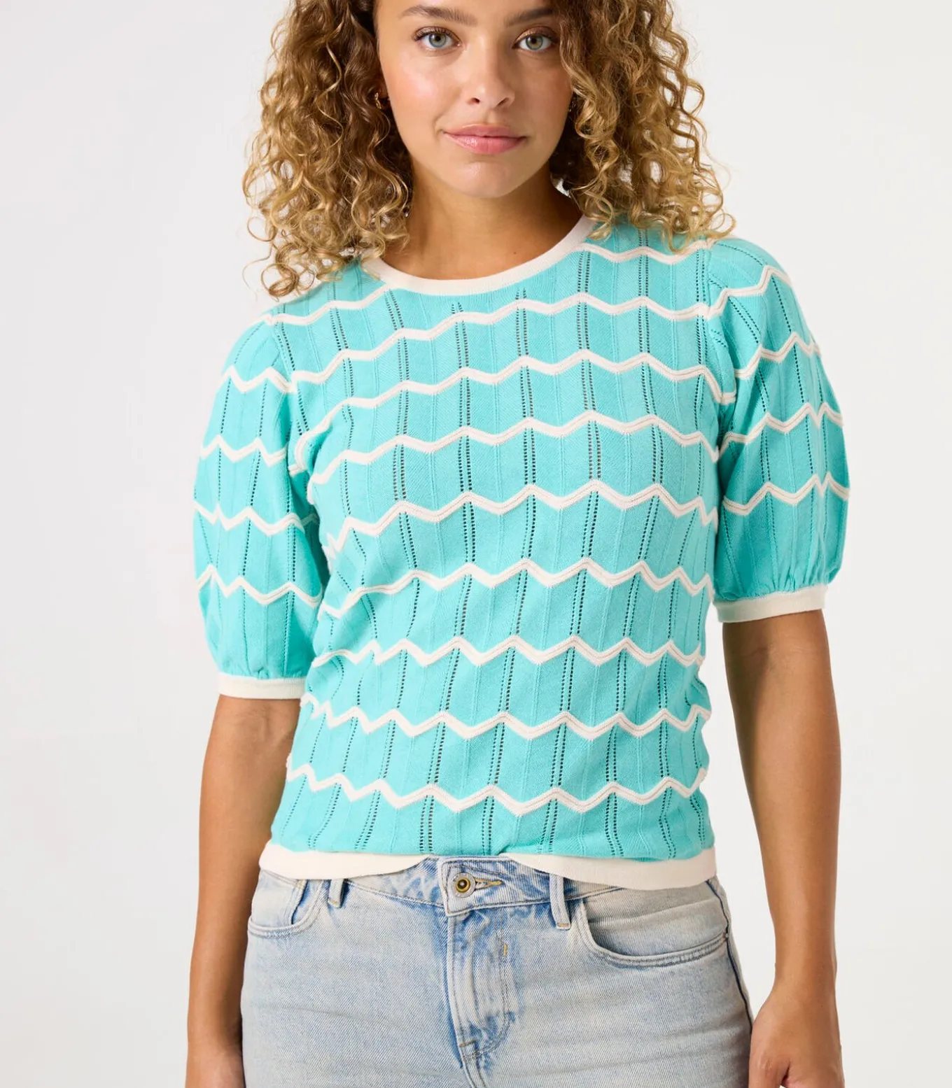 Ajour gebreide trui met patroon. Een item met een trendy print. Deze trui heeft korte pofmouwen, een ronde hals en een regular fit. Dit item is gemaakt van 100% katoen.Better Cotton is een initiatief dat zich wereldwijd inzet voor betere omstandigheden in de katoenindustrie.