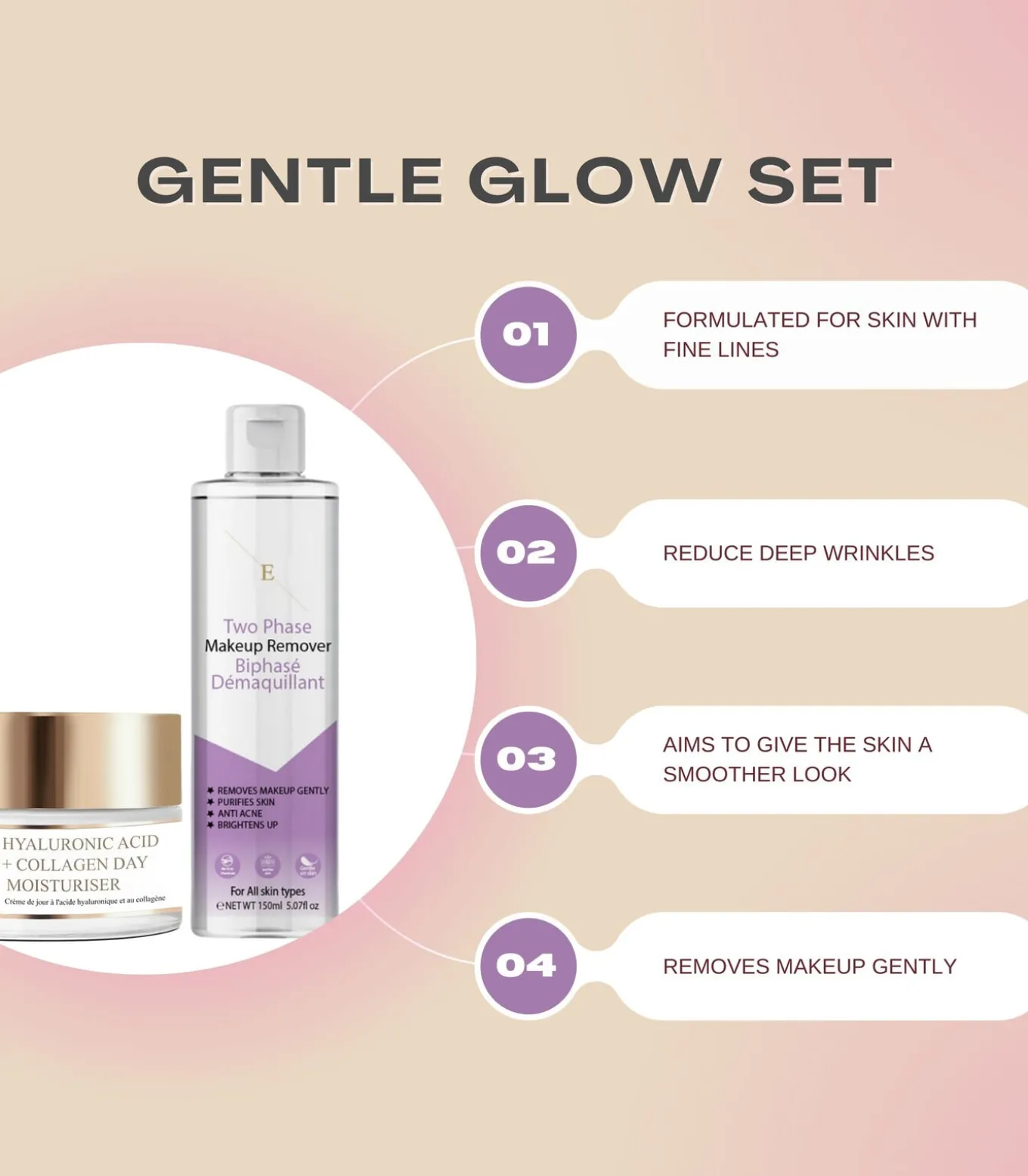 **Tweefasige make–up verwijderaar 150 ml*** **Zacht en effectief:** Onze tweefasige make–up verwijderaar is ontworpen om make–up, zonnebrandcrème en onzuiverheden voorzichtig en effectief van de huid te verwijderen zonder residu of agressieve chemicaliën achter te laten.* **Gemakkelijk te gebruiken:** Schud de fles eenvoudig om de twee fasen te mengen, breng de remover vervolgens aan op een wattenschijfje en veeg het zachtjes over het gezicht om make–up en onzuiverheden te verwijderen.* **Niet–strippend:** Onze make–up verwijderaar stript niet en droogt de huid niet uit, waardoor het perfect is voor gevoelige huidtypes.**Hyaluronzuur & Collageen Dagcrème 50ml*** **Hydraterend en voller:** Onze dagcrème met hyaluronzuur en collageen is ontworpen om de huid langdurig te hydrateren en op te vullen, waardoor deze zacht, glad en soepel aanvoelt.* **Anti–verouderingsvoordelen:** De combinatie van hyaluronzuur en collageen helpt fijne lijntjes en rimpels te verminderen, waardoor de huid er jeugdiger en stralender uitziet.* **Verzachtend en kalmerend:** Deze dagcrème is ook verzachtend en kalmerend, waardoor hij perfect is voor gevoelige huidtypes of mensen met huidproblemen zoals rosacea of acne.