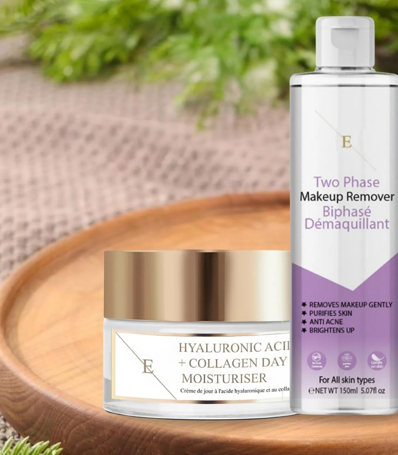 Tweefasige make-up verwijderaar + hyaluronzuur en collageen dagcrème