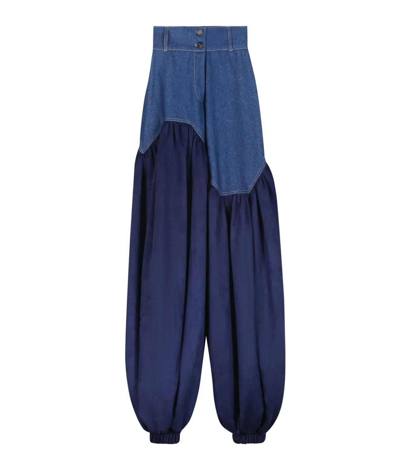 Tweekleurige denim met hoge taille, volledige lengte, ritssluiting met twee knoopsluiting en een asymmetrisch balloneffect aan de onderkant.