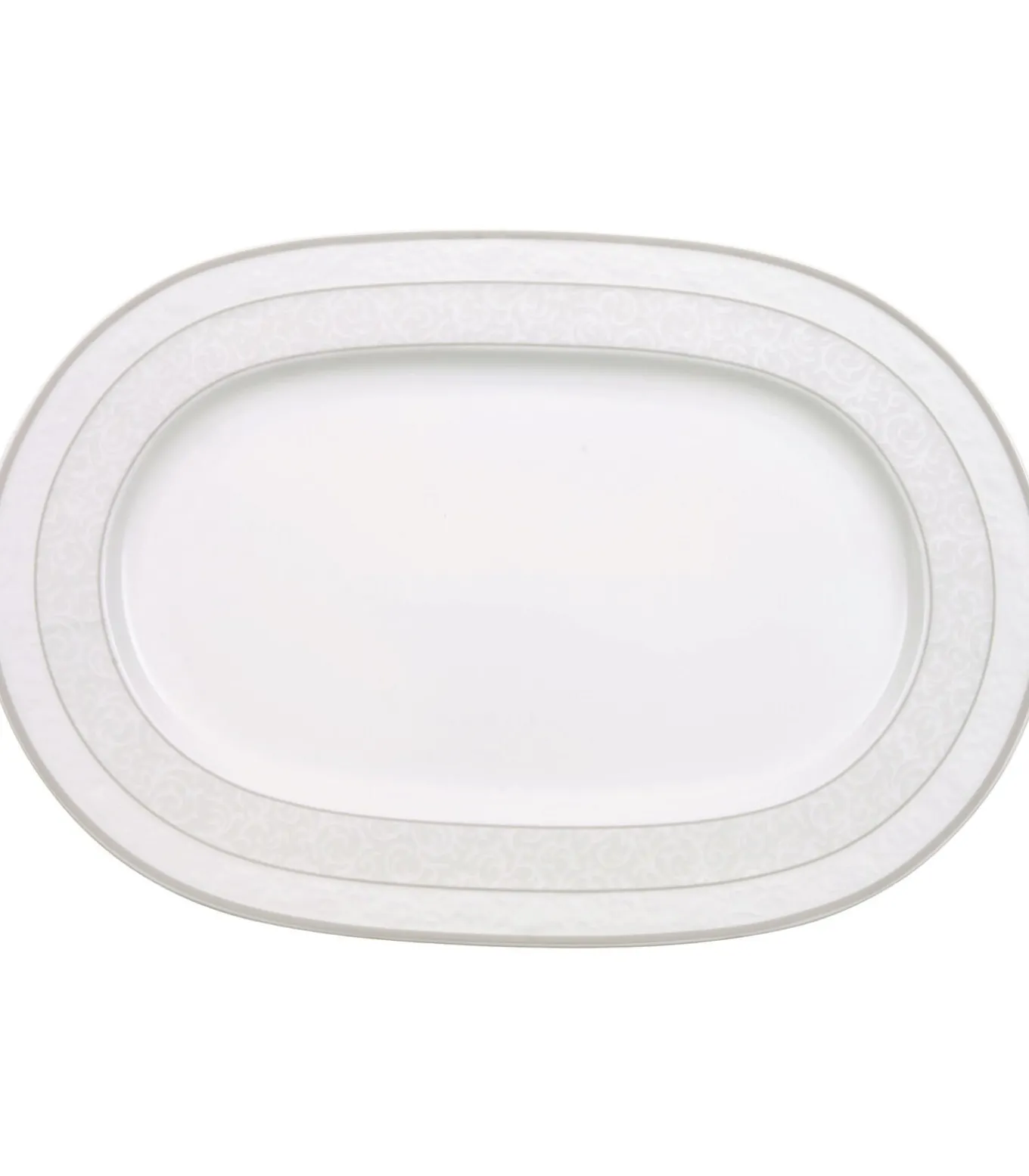 Met de collectie Gray Pearl brengt Villeroy & Boch elegantie op tafel: De klassieke vormen en subtiele decoraties in zacht zilvergrijs verlenen het decor een zweem van exclusiviteit. Villeroy & Boch staat sinds 1748 voor porselein van de allerbeste kwaliteit. De serveerschaal van de klassiek ontworpen collectie Gray Pearl verenigt harmonisch verfijnd reliëf en een grijs–glinsterende kleur. Presenteer uw gasten lekkere hapjes of sappige braadstukken van deze met filigrain gedecoreerde schaal/ Natuurlijk geschikt voor de vaatwasser.