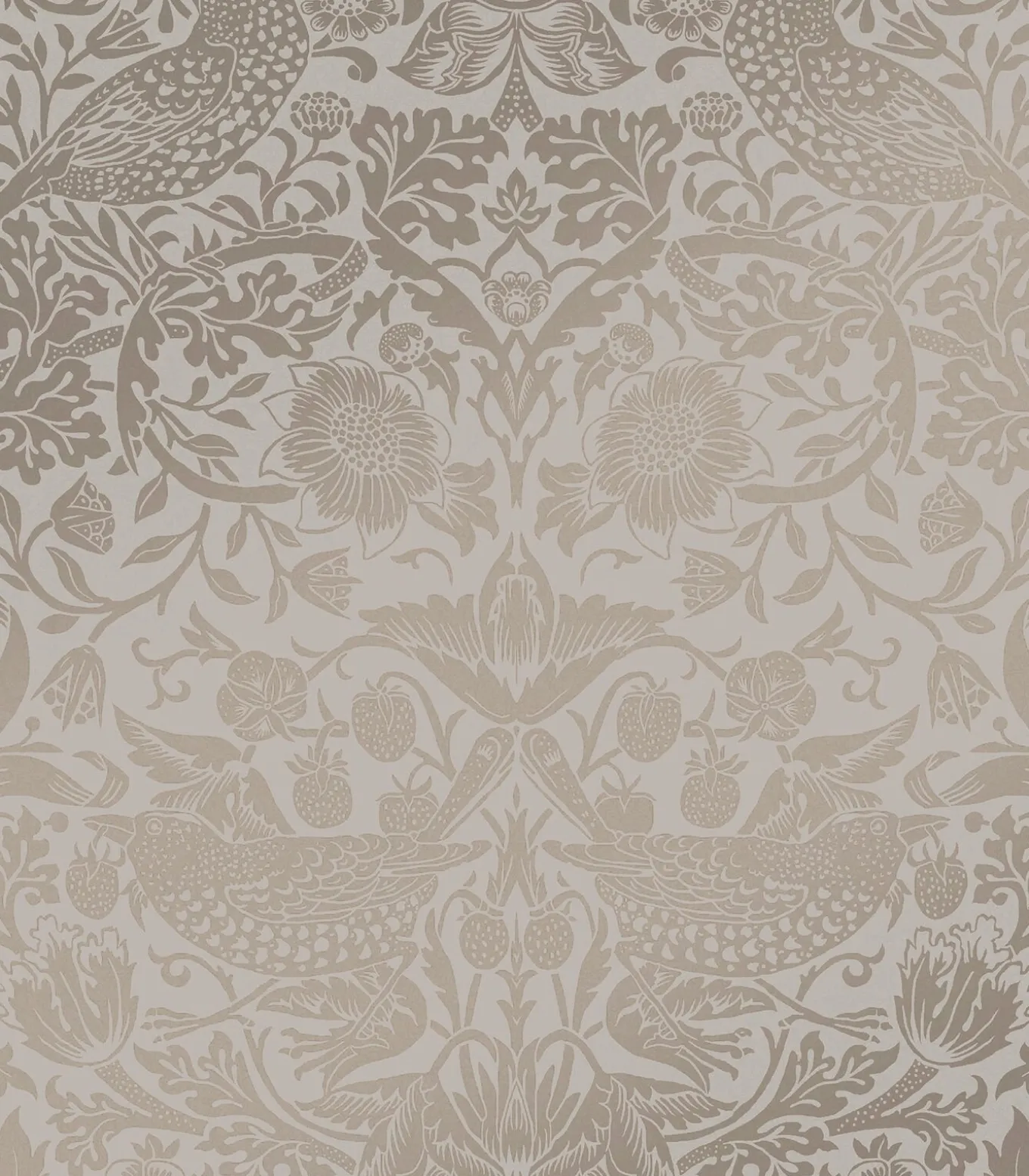 Transformeer uw interieur met het verfijnde William Morris at Home Vliesbehang Strawberry Thief Fibrous Neutral. De neutrale kleuren, gecombineerd met het kenmerkende bloemen– en bladerpatroon, voegen een tijdloze elegantie toe aan elke kamer. Het unieke patroon toont vogels, bekend als “strawberry thieves” in Engeland, te midden van weelderige aardbeien, wat een charmant en karakteristiek element toevoegt aan uw interieur. De metallic finish geeft een subtiele glans aan het behang, terwijl de vlakke kwaliteit een naadloze en professionele uitstraling garandeert.Met een rol van 10 meter bij 52 centimeter biedt dit behang voldoende dekking voor uw muren, ongeacht de grootte van de kamer. Het rechte patroon met een herhaling van 64 centimeter zorgt voor een gebalanceerde en harmonieuze uitstraling, terwijl de hoogwaardige kwaliteit en het gebruik van vlies zorgen voor een eenvoudige installatie en duurzaamheid.