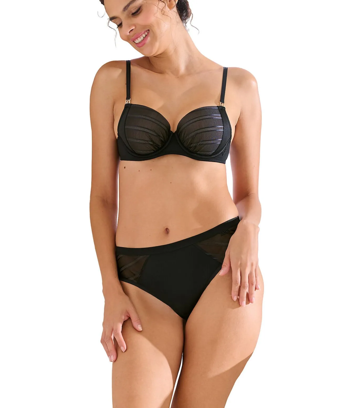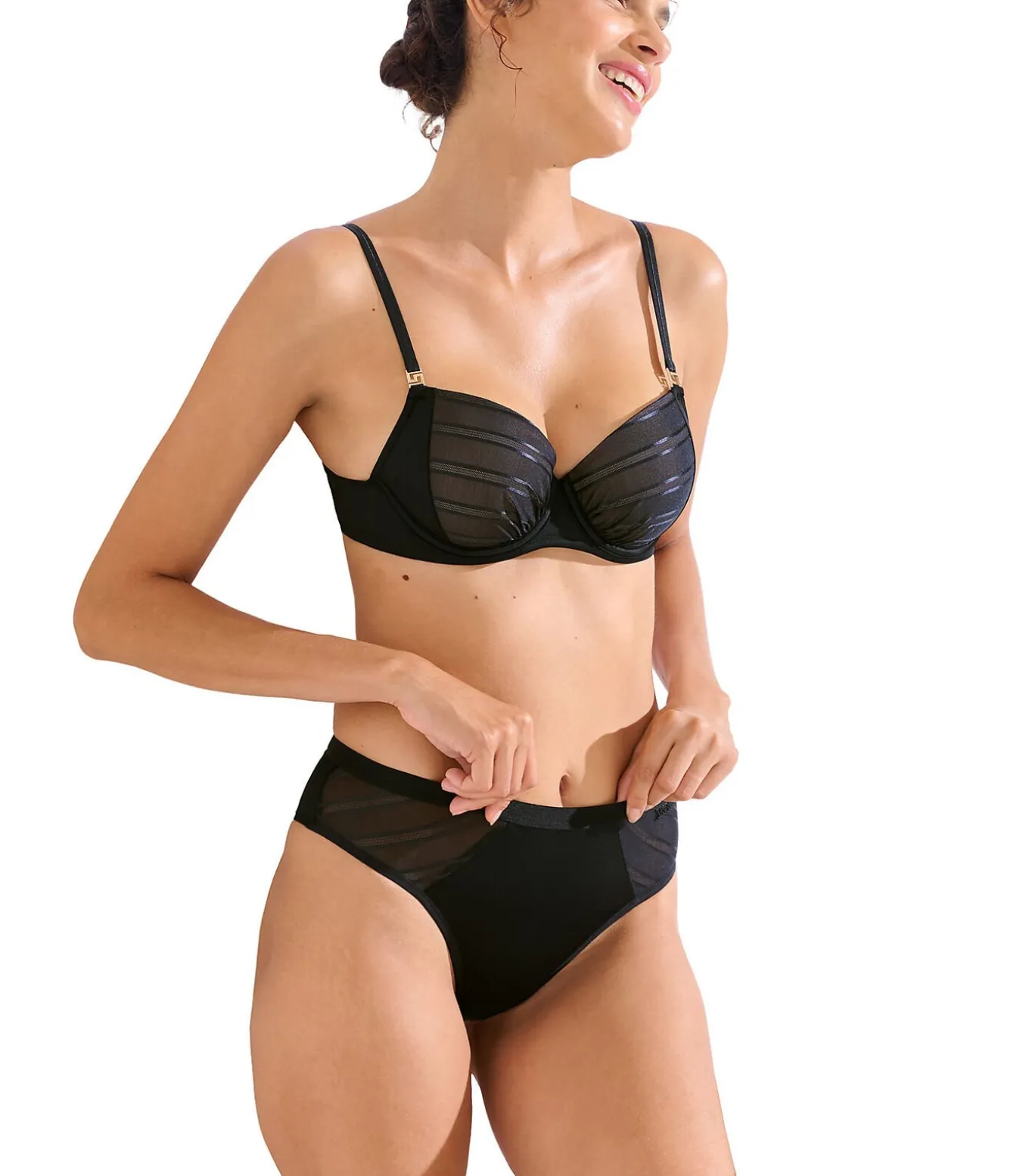 Circulair gebruik van gerecyclede vezels. Deze prestigieuze collectie dameslingerie is speciaal ontworpen voor Lisca’s 70e verjaardag en combineert elegantie en comfort op het hoogste niveau. Elk geraffineerd stuk is ontworpen voor de vrouw die prijs stelt op detail en kwaliteit. Het basismateriaal is een glad, hoogwaardig (‘duurzaam’) breisel dat zacht aanvoelt op de huid en dagelijks comfort garandeert. De benadering van duurzaamheid is prachtig, want sommige materialen zijn gemaakt van zorgvuldig geselecteerde gerecyclede materialen. Het gestreepte kantpatroon is zorgvuldig gekozen om het lichaam zacht te omhelzen en het silhouet subtiel te benadrukken. Het bijzondere aan deze bh’s zijn de bandjes, versierd met een elegante gouden metalen accessoire voor een extra vleugje luxe. Zachte, fluweelzachte cups zorgen voor perfect comfort. Deze serie is verkrijgbaar in klassieke kleuren die nooit uit de mode raken. Kies uit elegant zwart of zacht pastelroze.[Beha wordt apart verkocht. Kousen en andere accessoires die het model op de foto’s draagt, zijn niet inbegrepen].
