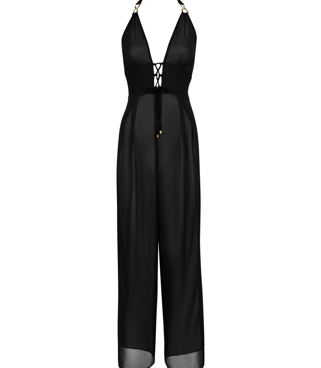 Het Beach Walk broekpak heeft een diepe halslijn, benadrukt door een resoluut sexy vetersluiting en omlijst door elegante gouden accenten op de bandjes. Met zijn wijde pijpen en omgezoomde taille creëert het een geraffineerd, elegant silhouet.