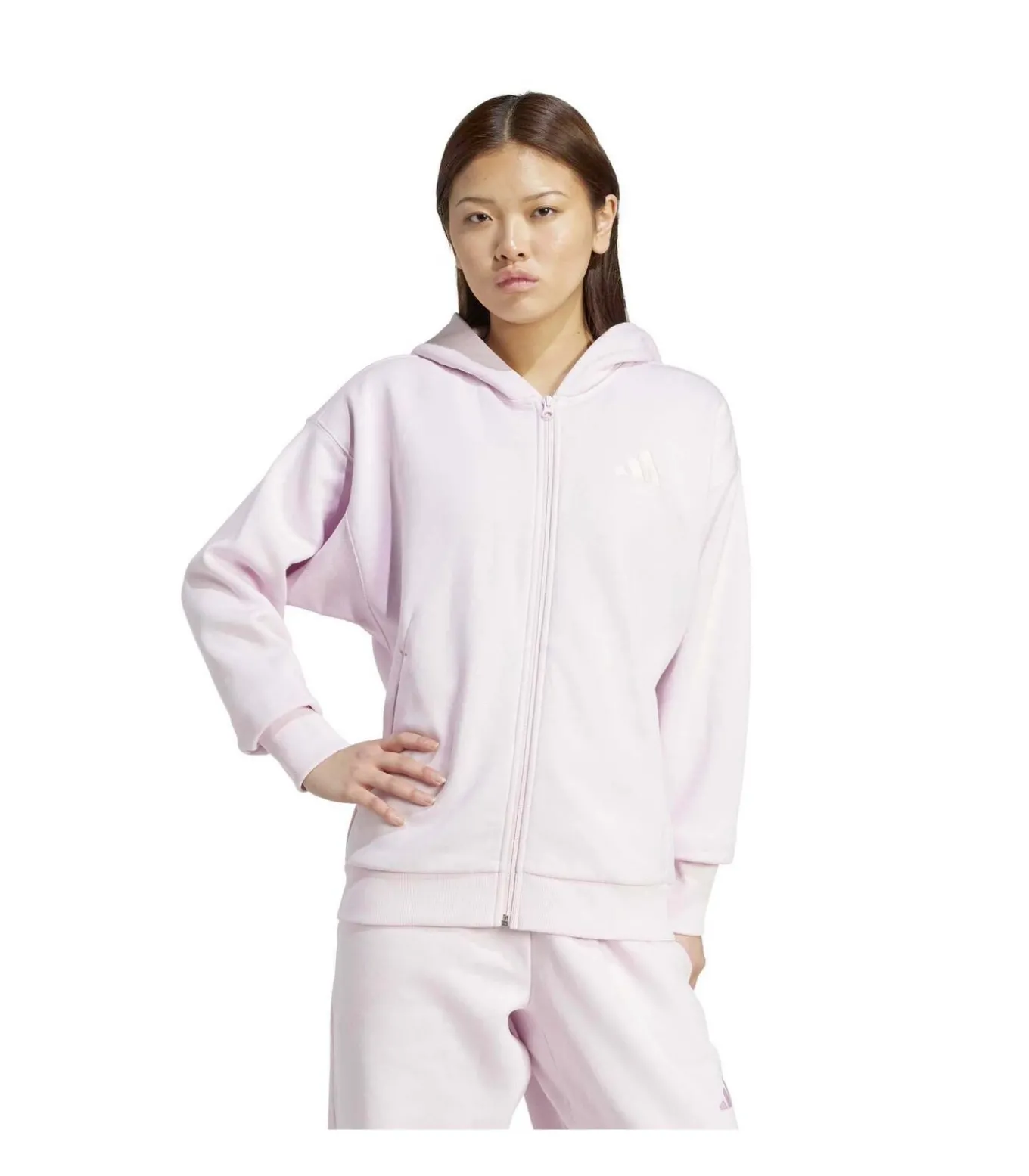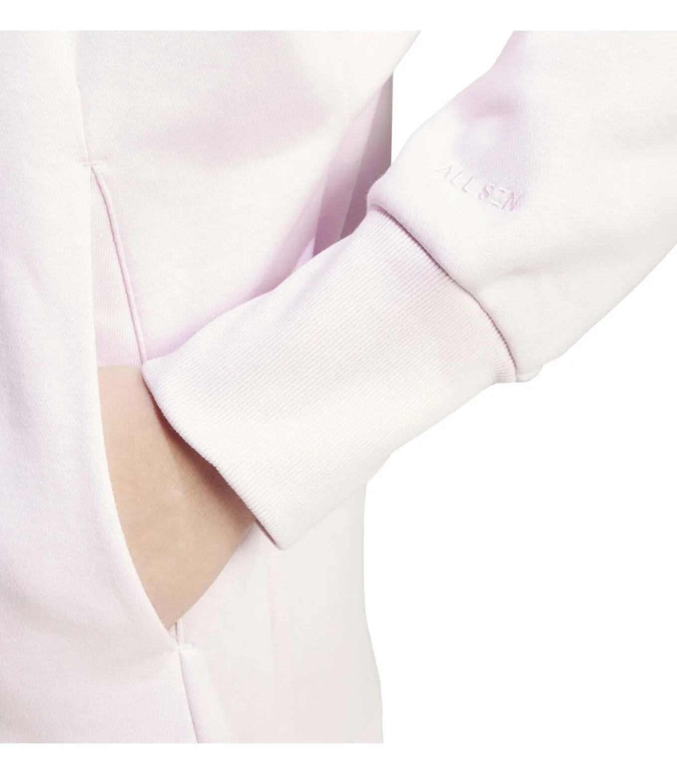 Kleur: Clpink. Samenstelling: 70% katoen / 30% gerecycled polyester. Mouwen: vleermuismouwen. Halslijn: capuchon. Pasvorm: casual. Details: verlaagde schouders, geribbelde manchetten en zoom, plooien aan de voorkant met verborgen steekzakken. Duurzaamheid: gemaakt van katoen van Better Cotton en gerecycled polyester. Gebruik: ideaal voor vrije tijd, dagelijkse boodschappen of ontspanningsmomenten.