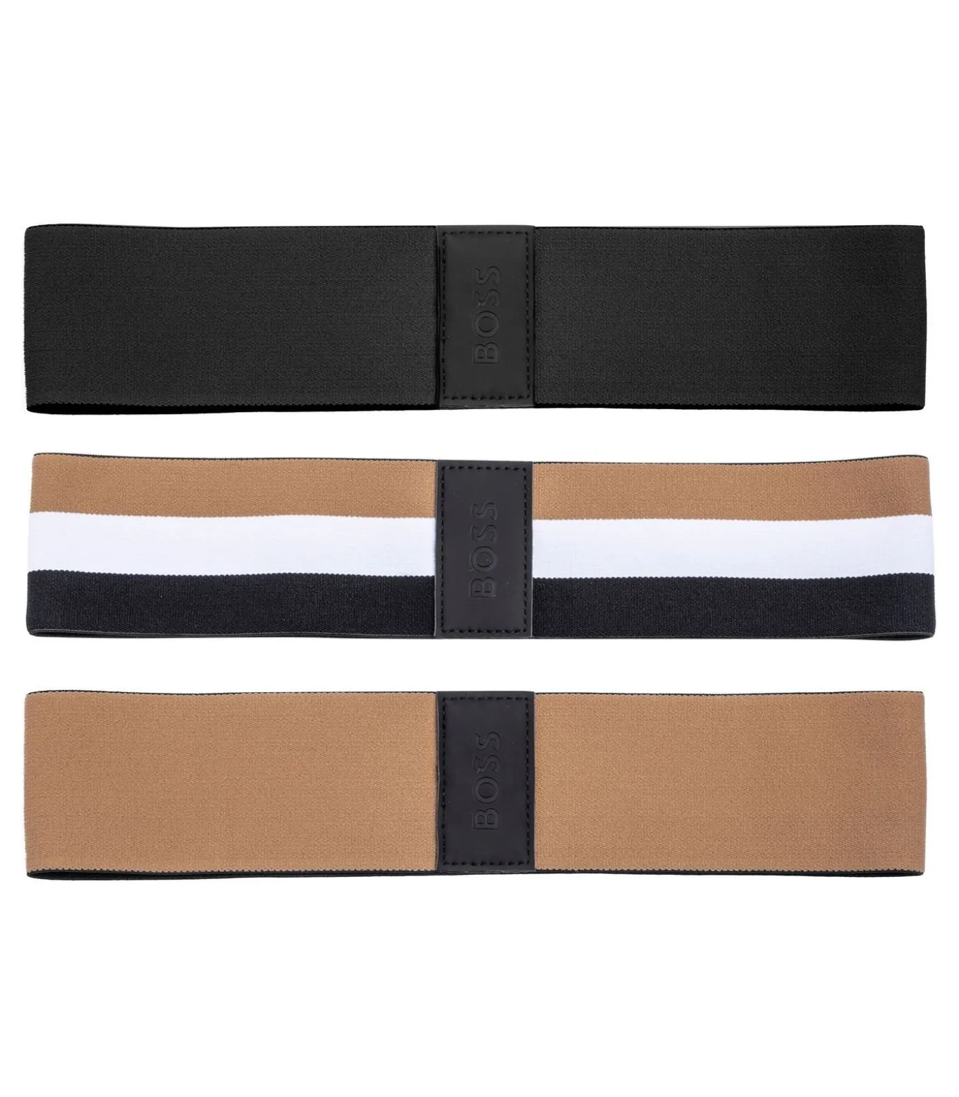 Deze set van 3 weerstand banden brengt de perfecte finishing touch aan elke BOSS activewear outfit. Met de driekleurige iconische strepen, en afgewerkt met luxe matte textuur handtekening tags, de banden bieden een inkeping van ingetogen elegantie aan alle sportieve activiteiten. Gemaakt van Nylon & latex, zijn deze weerstand banden gemaakt om te worden gebruikt tijdens elke lichamelijke oefening. Elke band is 6,5 cm hoog. De camel band heeft een weerstand van 9Kg, de driekleurige een weerstand van 14Kg, en de zwarte een weerstand van 21 Kg. Dimensions: 330 x 65 mm, Material: Nylon
