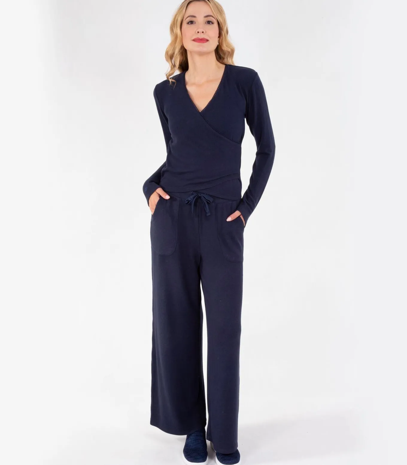 Dit prachtige marineblauw t–shirt met lange mouwen en cache coeur voor dames zal zeker in de smaak vallen dankzij het ultrazachte gevoel omdat de top grotendeels gemaakt is van ECOVERO™ viscose. Dit ongelooflijk zachte navy wikkel–T–shirt voor dames combineert veel comfort met elegantie dankzij de kanten rand. Het kan worden gedragen in combinatie met het sweatshirt met rits. Het model is 177 cm lang en draagt maat 34/36.