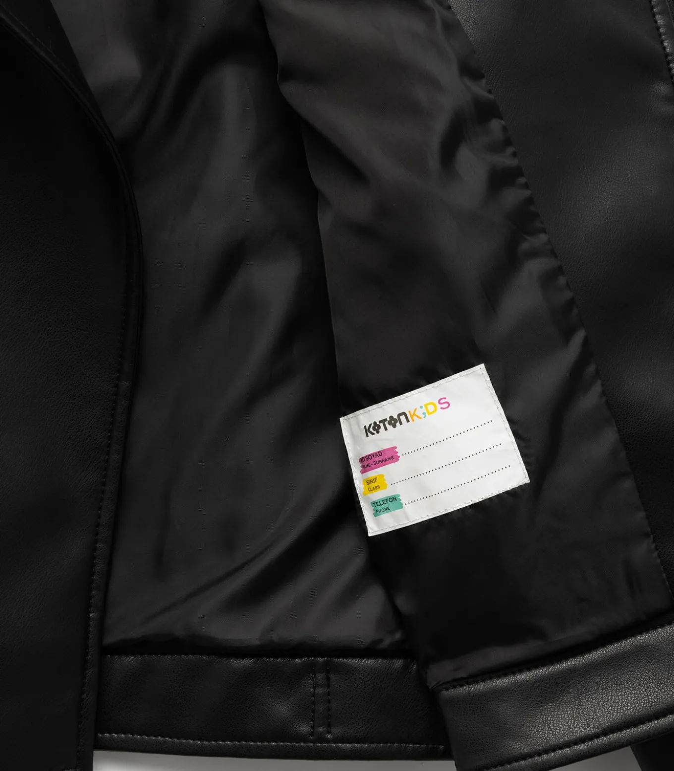 Geef je kind een stoere en moderne look met deze zwarte biker jas van kunstleer. De jas is voorzien van een kruiskraag en lange mouwen, en biedt praktische zakken met ritsen. Ideaal voor dagelijks gebruik of speciale gelegenheden, deze jas combineert stijl en comfort voor elk seizoen.