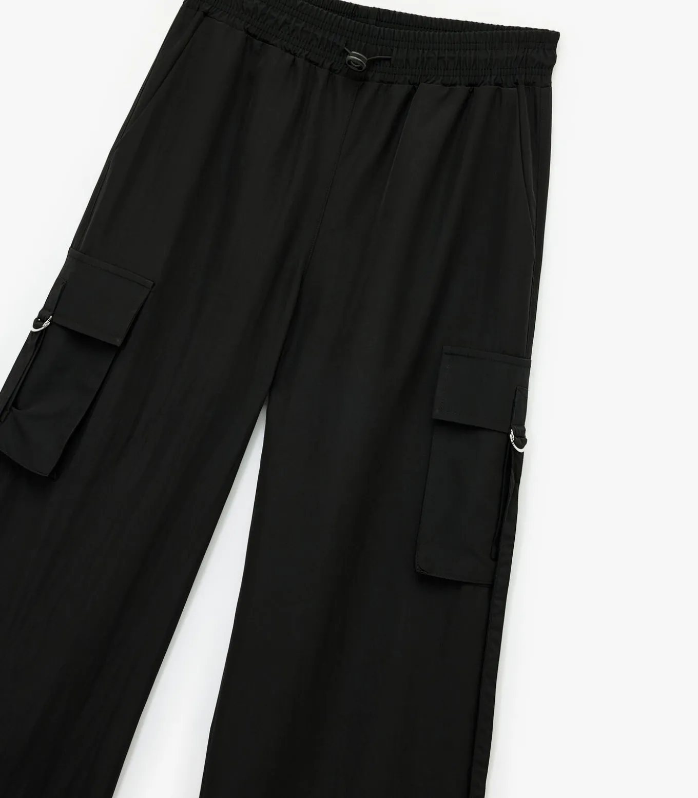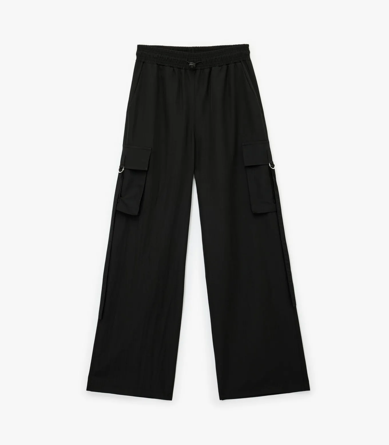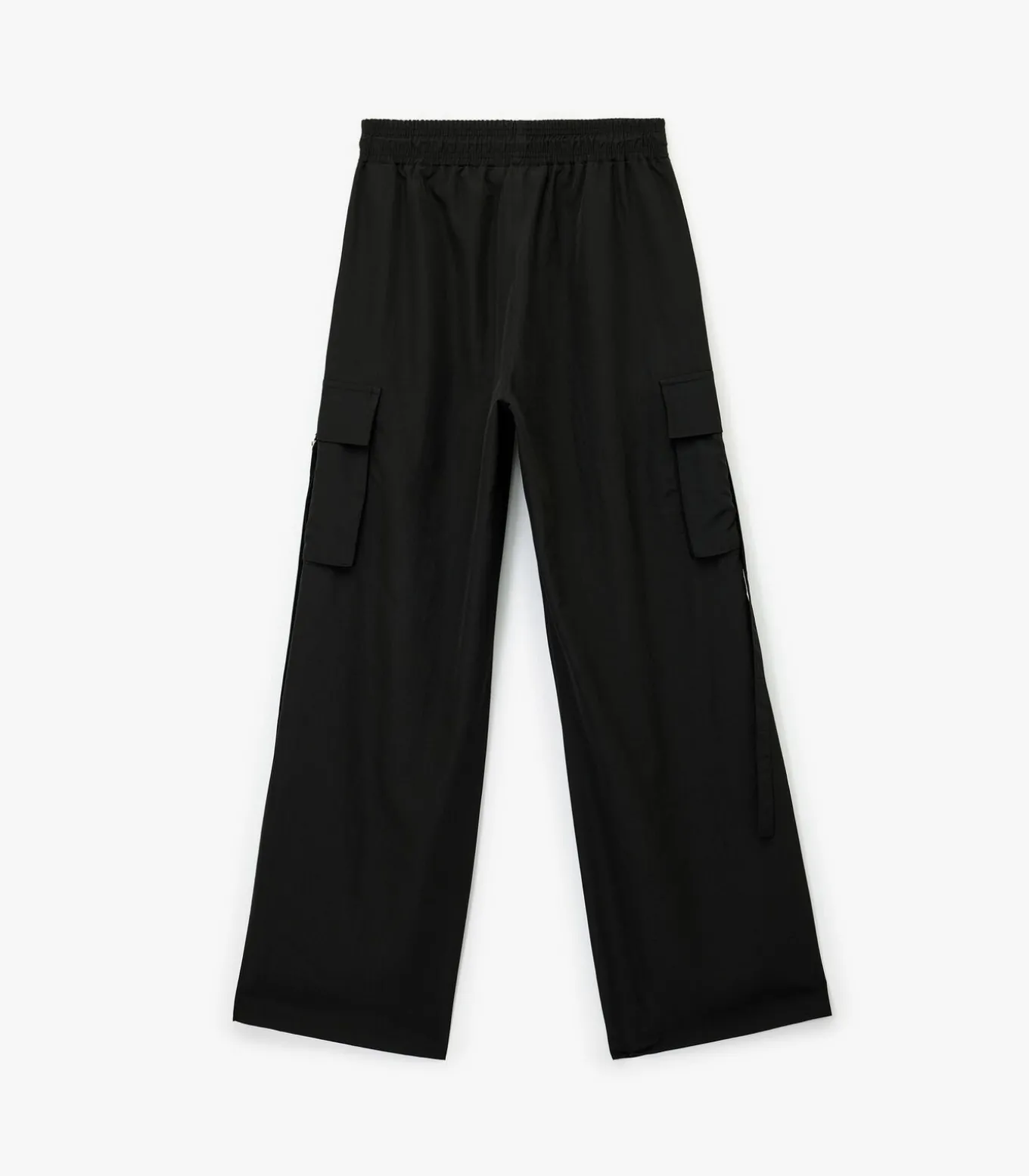 Deze zwarte broek biedt een moderne stijl met zijn hoge taille en zakdetails. Ideaal voor een casual look dankzij de wijde pijpen en het comfortabele ontwerp. Perfect te combineren met een eenvoudig T–shirt of een stijlvolle blouse voor verschillende gelegenheden.