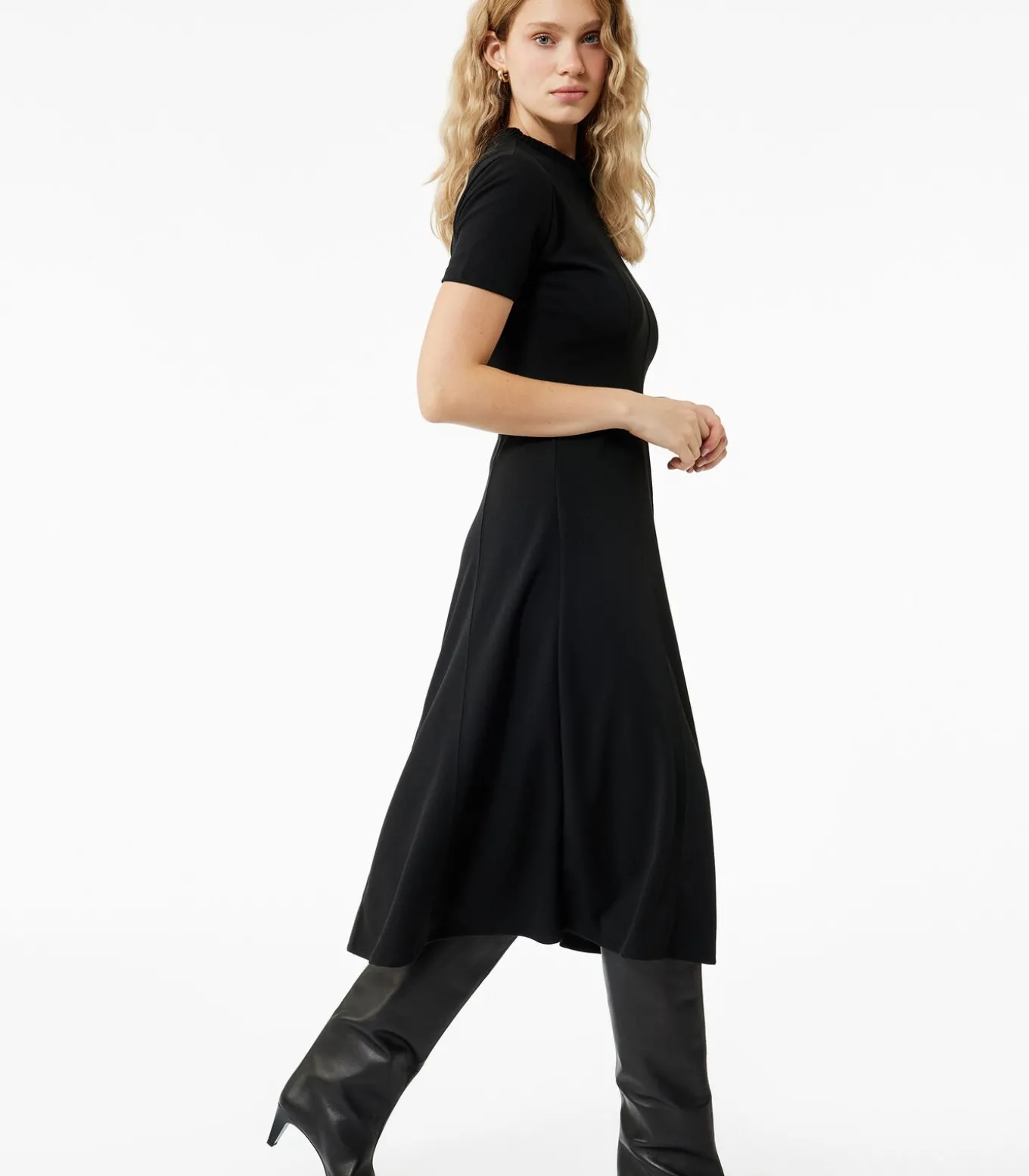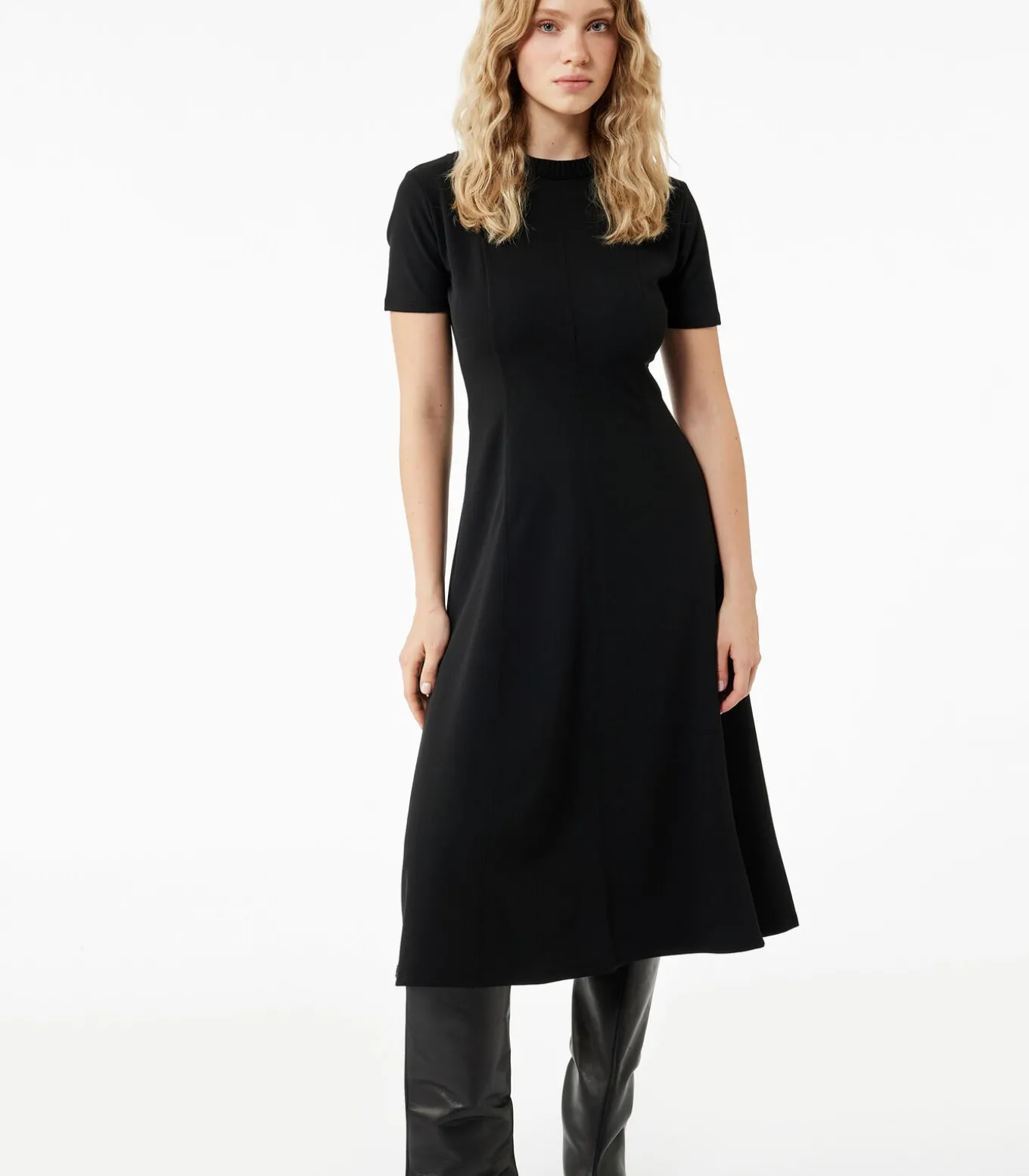 Deze stijlvolle zwarte midi–jurk is perfect voor diverse gelegenheden. Met een slanke pasvorm en korte mouwen biedt hij zowel comfort als elegantie. De ronde hals geeft de jurk een klassieke uitstraling, ideaal voor zowel casual als formele gelegenheden. Combineer met je favoriete accessoires voor een complete look.