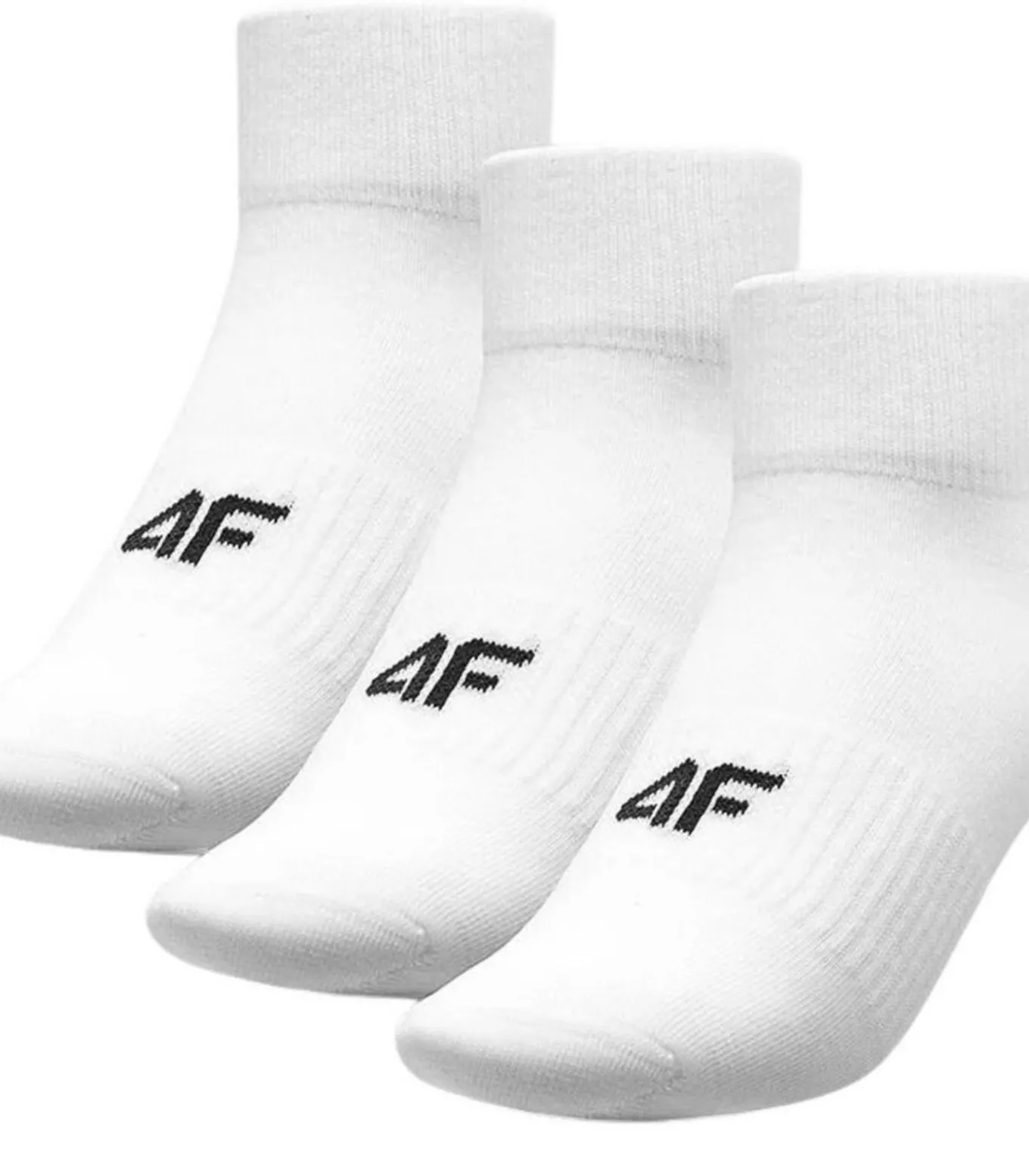 4F–sokkenmodel 4FAW23USOCM204 – deze witte sokken zijn gemaakt van 72% katoen, 26% polyamide en 2% elastiek. Het materiaal is gebreid en het ontwerp draagt het logo afgedrukt. Deze sokken hebben elastieke eigenschappen, zodat ze ademend zijn en duurzaam. Ze hebben een elastische manchet en versterkte hiel en teen. Het pasbeeld is strak.