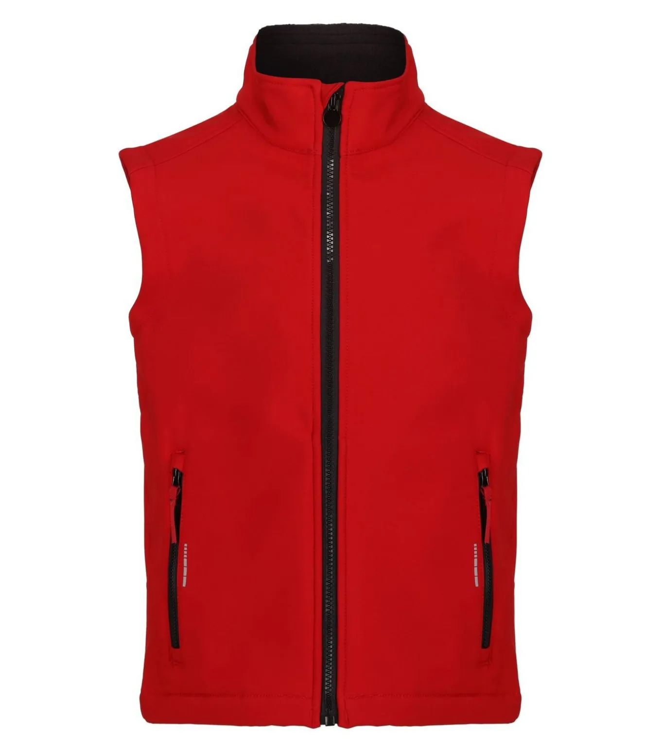 Deze productomschrijving betreft een kinder/kinder softshell reflecterend gilet van Regatta. Het buitenmateriaal is 100% polyester softshell stof met stretch en geweven eigenschappen. Er is geen voering. Het ontwerp is effen zonder afbeeldingen. Kenmerken zijn een ritsbeschermer aan de binnenkant, bedrukbare oppervlakken en reflecterende details voor zichtbaarheid bij weinig licht. Het mouwloze kledingstuk heeft een opstaande kraag bij de hals. Onderaan zitten twee zakken met ritssluiting. Het gilet wordt gesloten met een rits over de hele lengte aan de voorkant. Dit gilet is geschikt voor toepassing van zeefdruk, transferdruk of vinyl graphics.