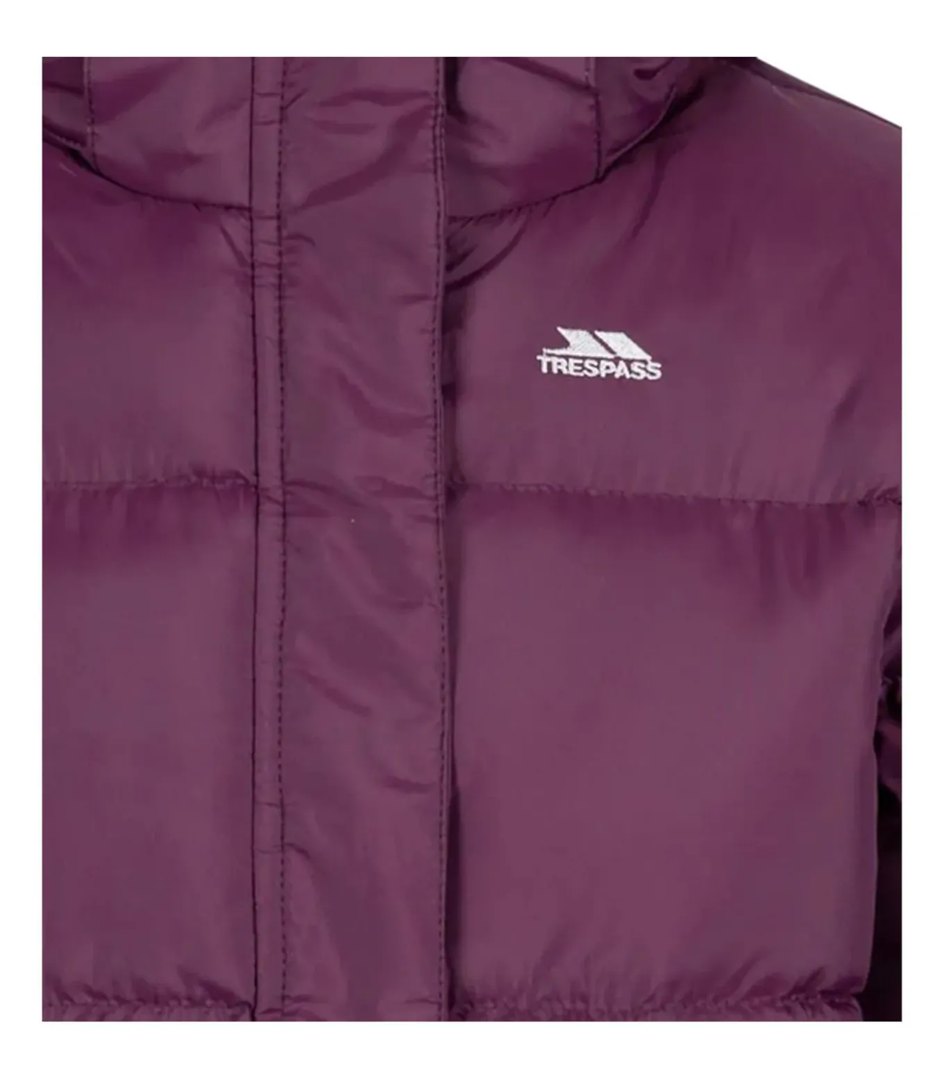Deze gewatteerde jas van Trespass Girls heeft lange mouwen en een afneembare capuchon. De buitenkant, vulling en voering zijn gemaakt van 100% polyester. De stof is geweven en behandeld met water– en windafstotende technologieën. Elastische manchetten en een volledige ritssluiting aan de voorkant zijn inbegrepen. Twee steekzakken met paspels bieden opbergruimte. Logodetails en de gewatteerde vorm maken het casual ontwerp compleet.