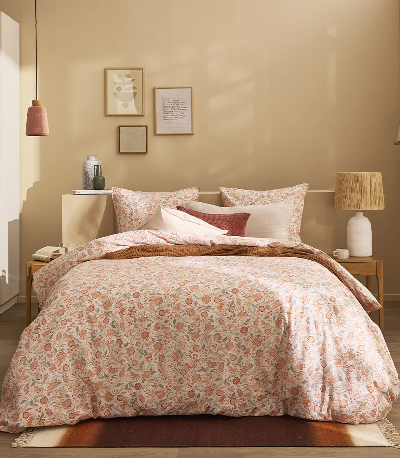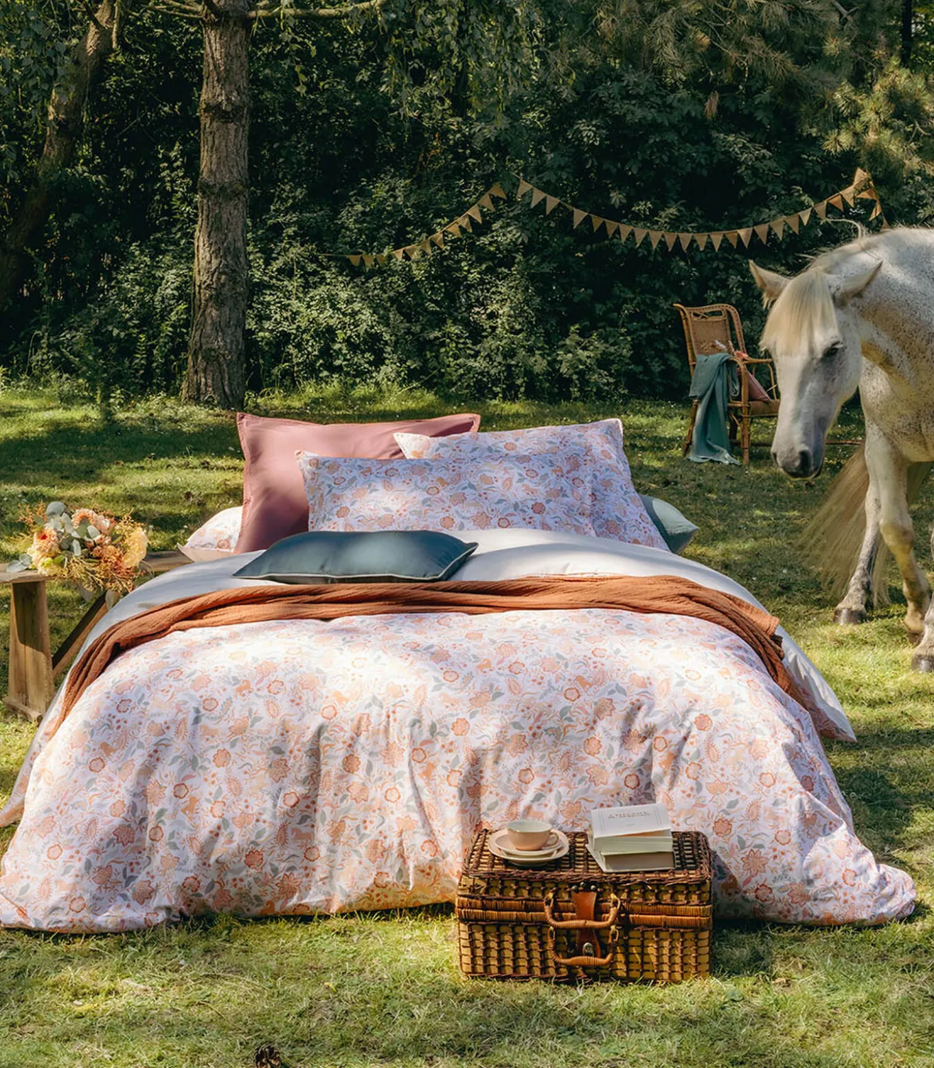 Laat je meevoeren op een golf van zachtheid en romantiek met Allure, waar de verfijning van bloemmotieven samenkomt met de omhullende zachtheid van katoen perkal. Dit omkeerbare model is ontworpen voor diegenen die elegantie waarderen in elk detail. Het hoofdmotief is een eerbetoon aan de natuur, met fijn getekende bloemen en paarden die door het gebladerte galopperen. Dit landelijke tafereel wordt gecontrasteerd door een zacht, rustgevend roze op de achterkant. Warme, natuurlijke kleuren om een levendige sfeer te creëren.