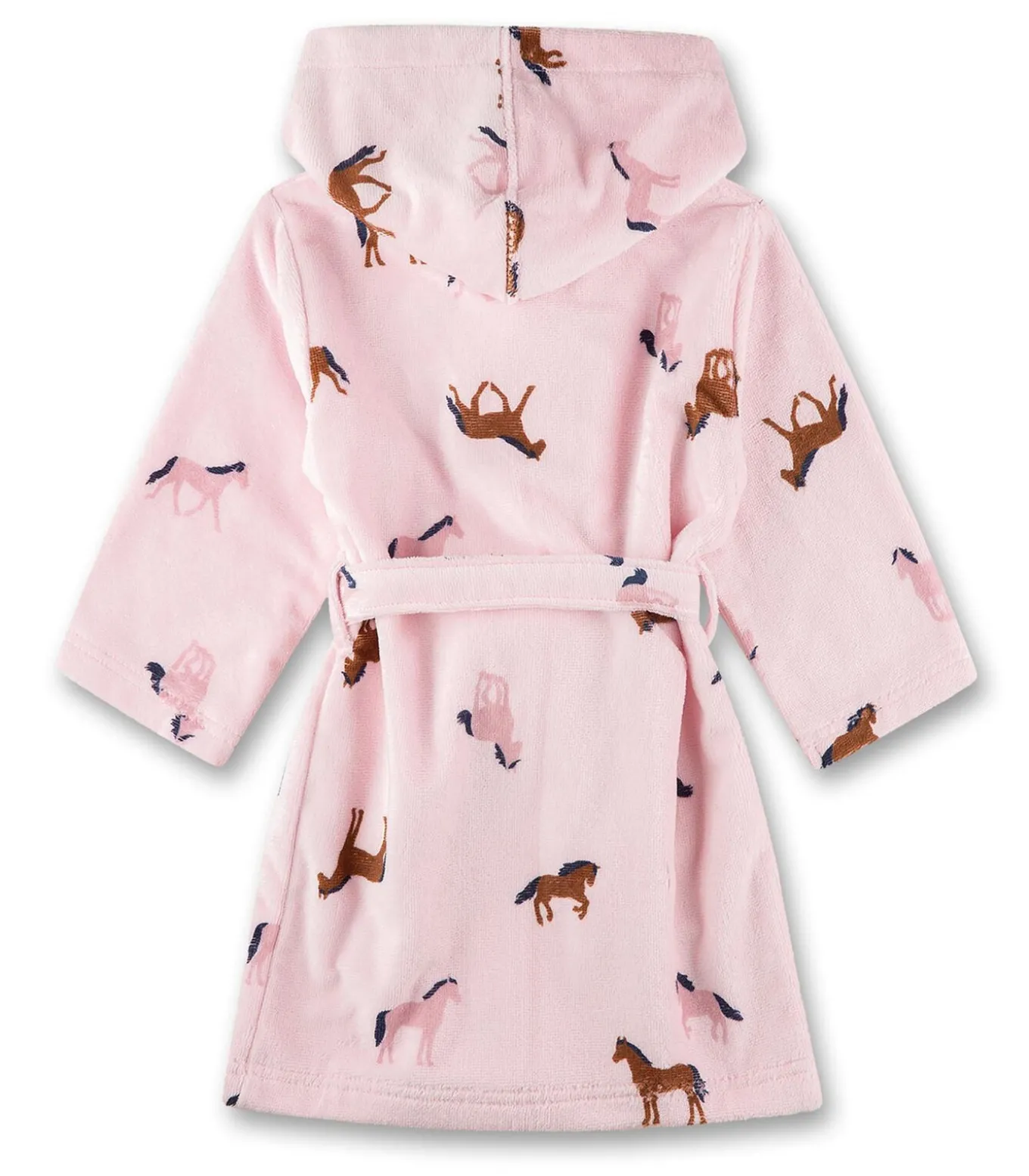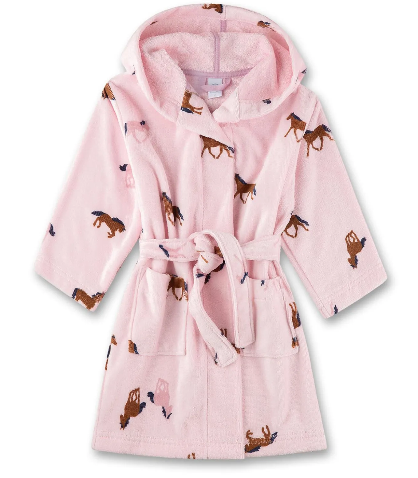 Badjas voor meisjes van het merk Sanetta. Kinderbadjas met paardenprint en capuchon. Met twee steekzakken en een bindceintuur.