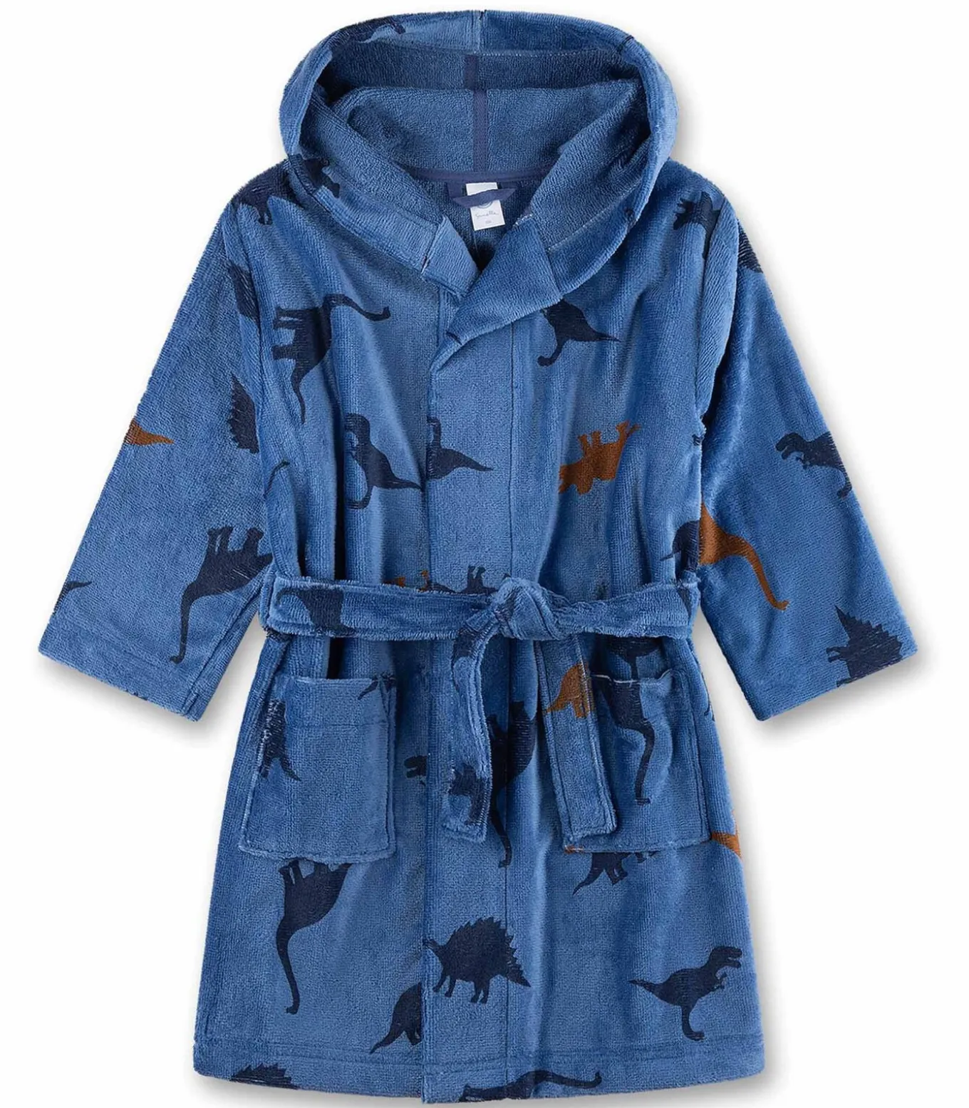 Badjas voor jongens van het merk Sanetta. Badjas met all–over dinosaurusmotief. Met capuchon, steekzakken en bindceintuur.