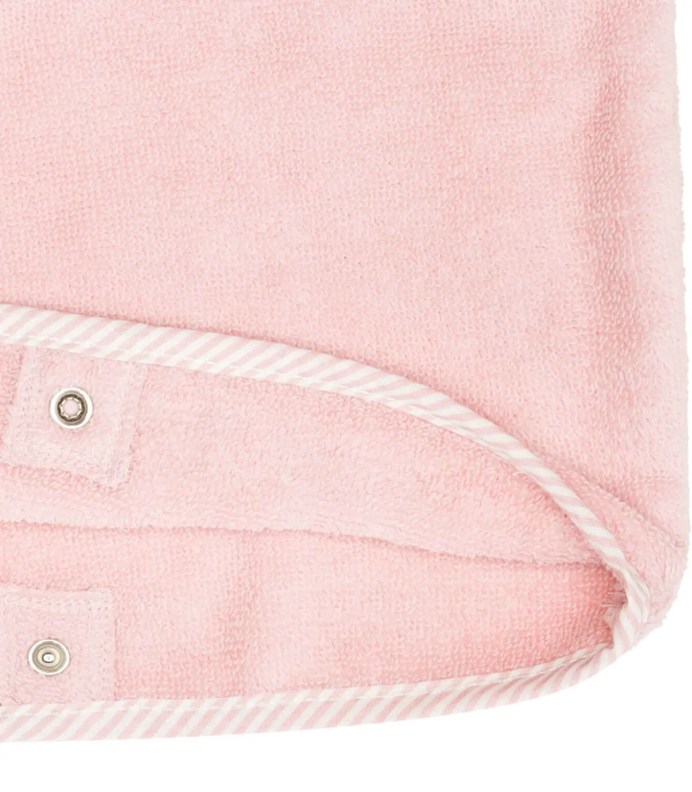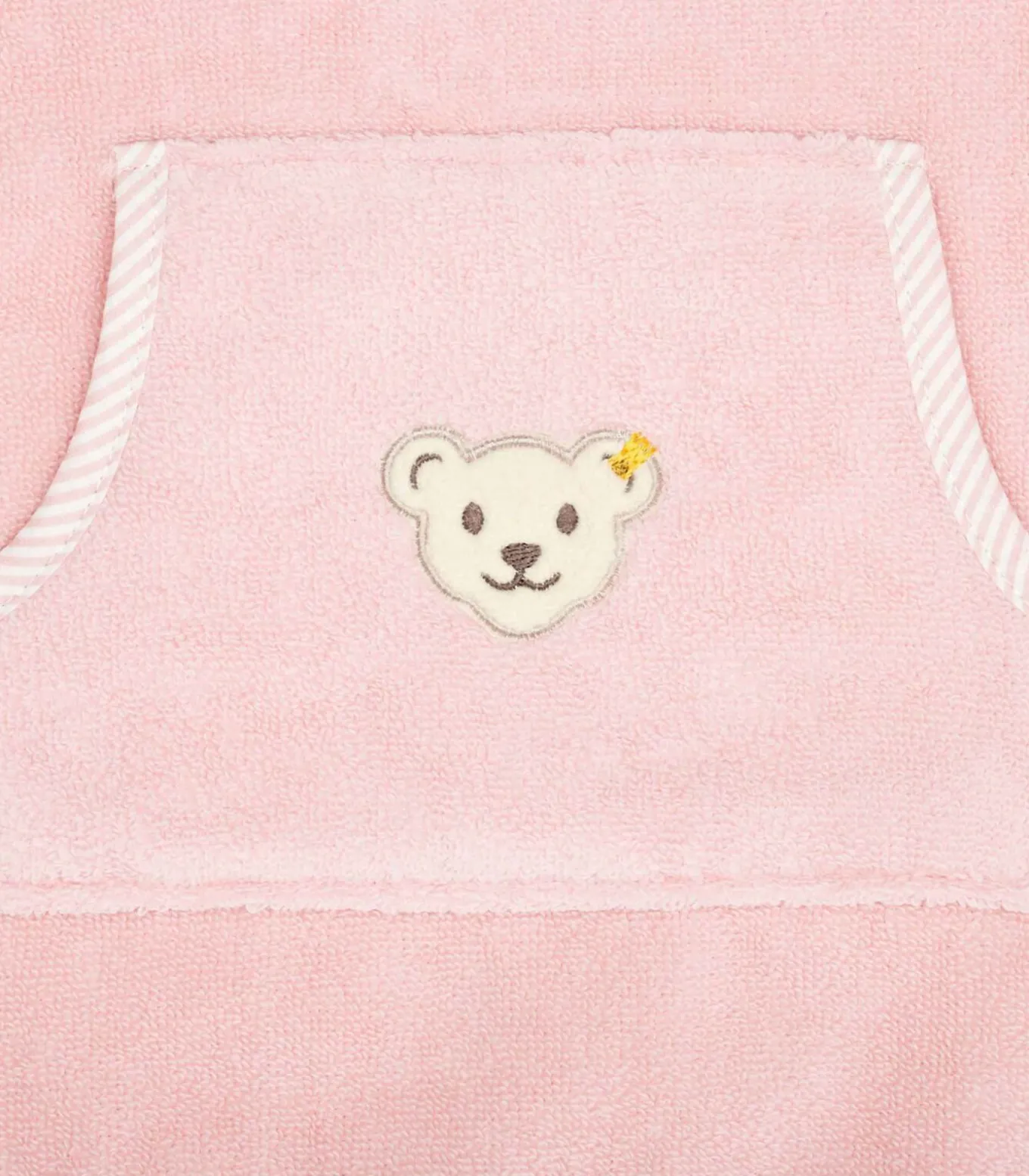 Pluizige, zachte badstof badponcho van het merk Steiff. Met een grote capuchon en drukknopen aan de zijkant. Teddybeermotief op de zak. Puur katoen.