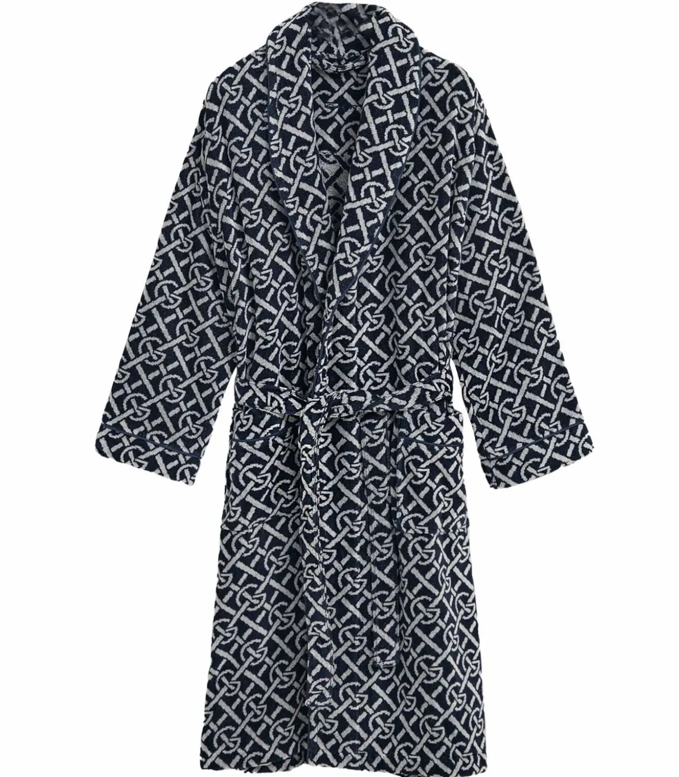 Gedessineerde badjas voor dames en heren van het merk GANT. Hoogwaardige badstof van velours gemaakt van puur biologisch katoen. Met sjaalkraag, ceintuur en opgestikte zakken.