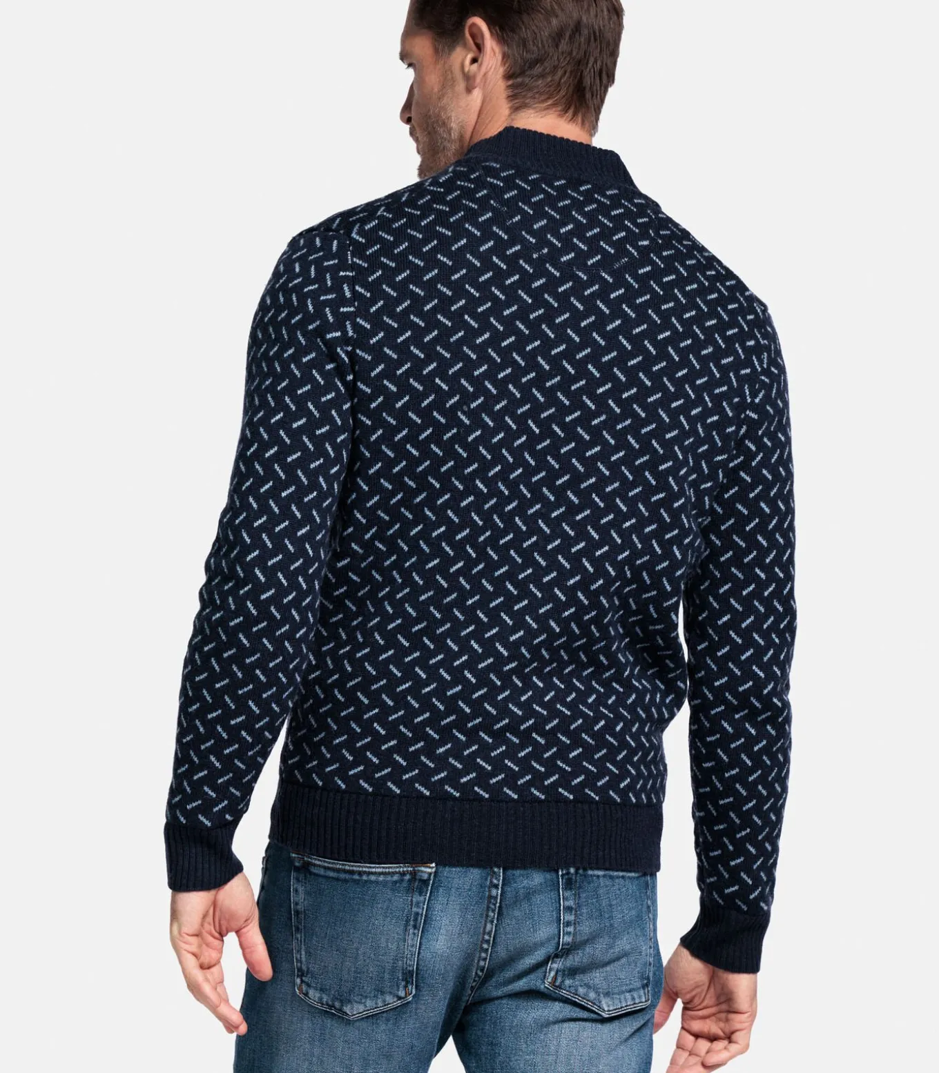 Deze moderne fit trui is uitgevoerd in lamswol met een all–over jacquardpatroon in diagonale strepen. De halve rits, opstaande kraag en ribboorden zorgen voor een comfortabele pasvorm. Draag solo of onder een bodywarmer voor een warme, winterse look.