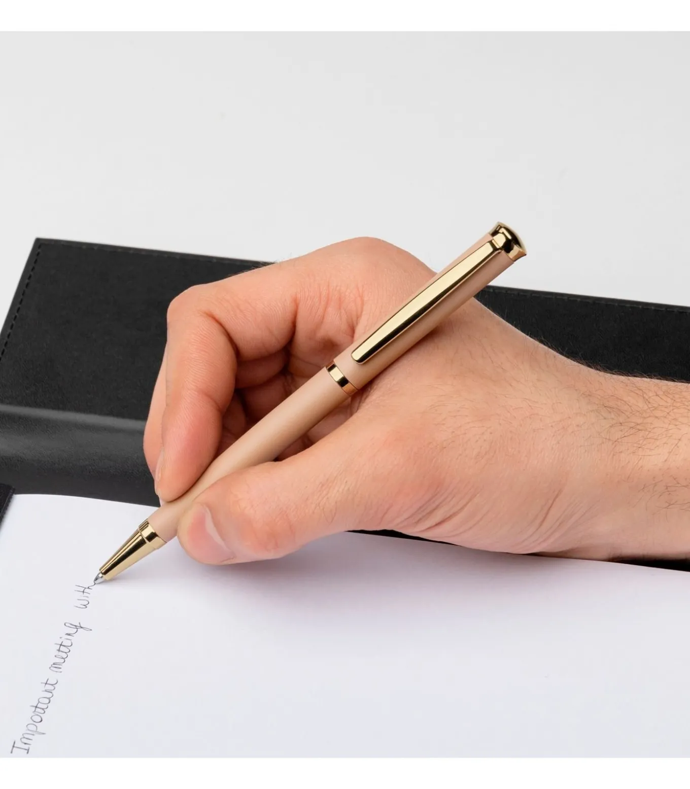 De vrouwelijke & slanke “sophisticated” pennen zijn dit jaar in een nieuw jasje gestoken, passend bij onze nieuwe vrouwelijke “Triga” accessoirelijn met een reeks warme & neutrale tinten: zwart, taupe & nude, deze schrijfinstrumenten zijn perfect te mixen & matchen in combinaties die passen bij uw smaak, om zo ingetogen maar verfijnde geschenksets te creëren. De vergulde afwerking zorgt voor de laatste luxe en vrouwelijke touch. Dimensions: DIA.9.8/H.136 mm, Material: Brass,Lacquer