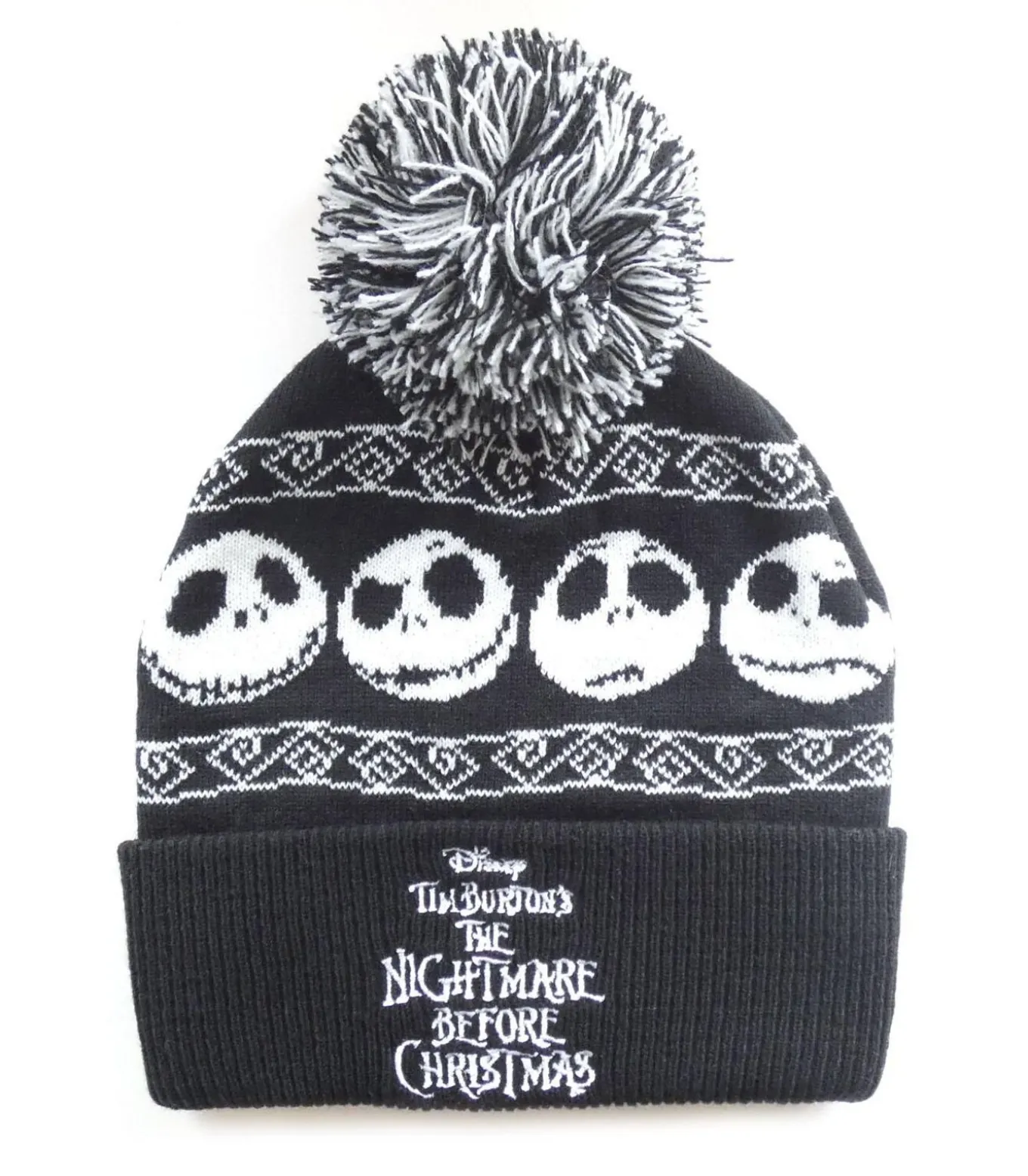 Nachtmerrie voor kerstmis, basismodellen – mutsen – zwart, gemaakt van acrylwol. Dit product draagt het ontwerp met logo en herhaalafdruk. Het heeft ook een Pom Pom en opgerolde manchetten. De afbeeldingen tonen de hoofdpersoon Jack Skellington.