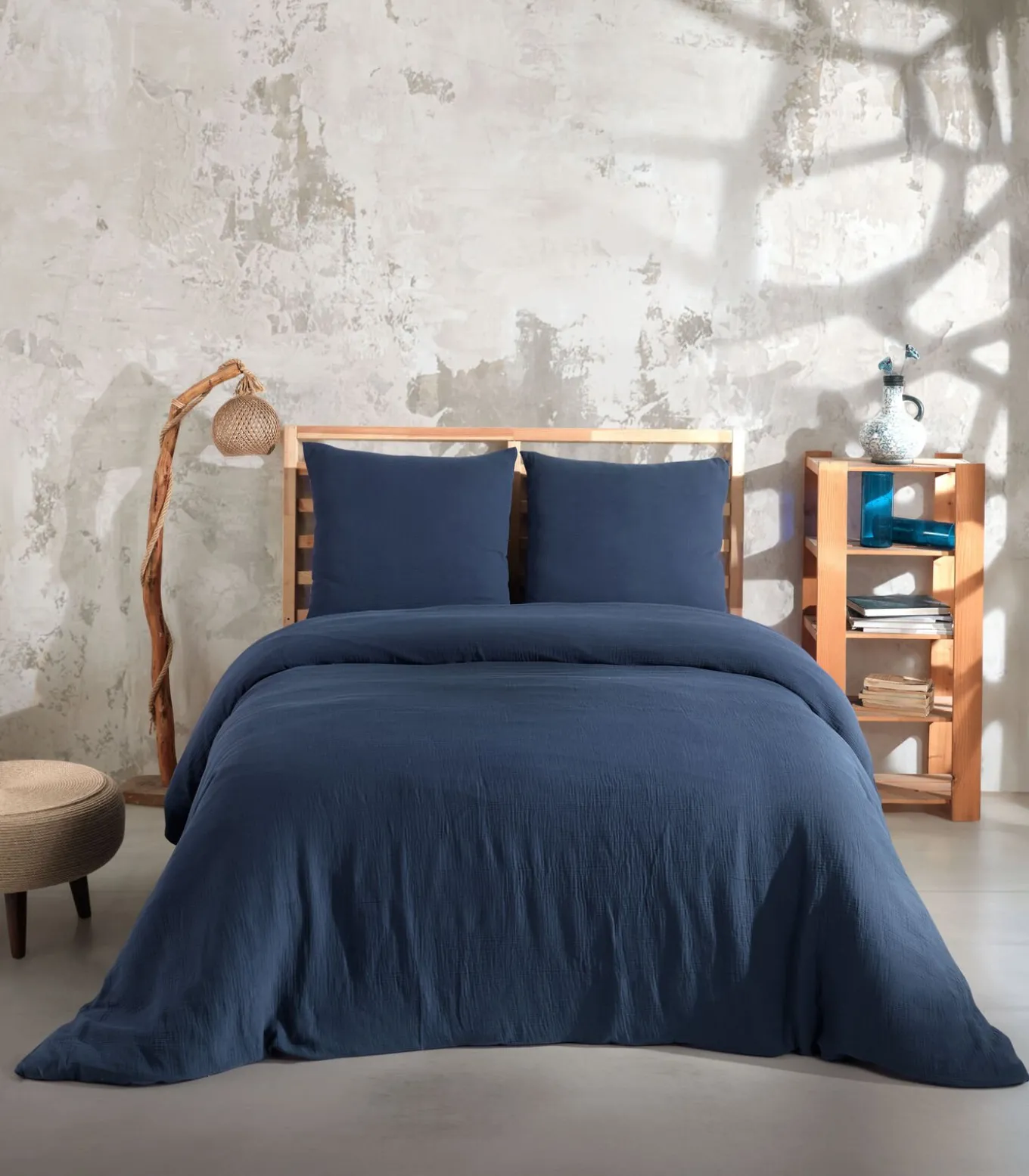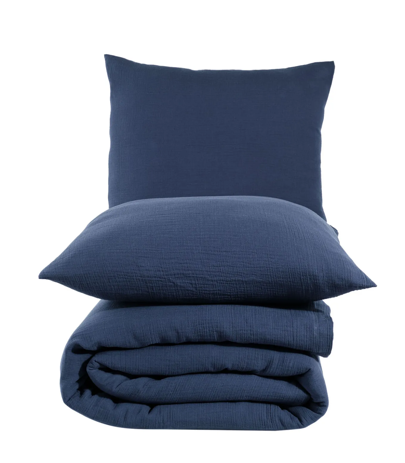 Katoen gaas musseline–Beddengoed + kussenslopen 65×65. Knoopsluiting. 100% katoen gaas musseline. Oeko–Tex gecertificeerd. Machinewasbaar op 40°C. Maten:140×200 cm+ 1 kussensloop voor 1 persoon, 200×200 + 2 kussenslopen cm voor 1 of 2 personen, 240×220 cm + 2kussenslopen voor 2 personen, 260×240 +2 kussenslopen cm voor 2 personen.