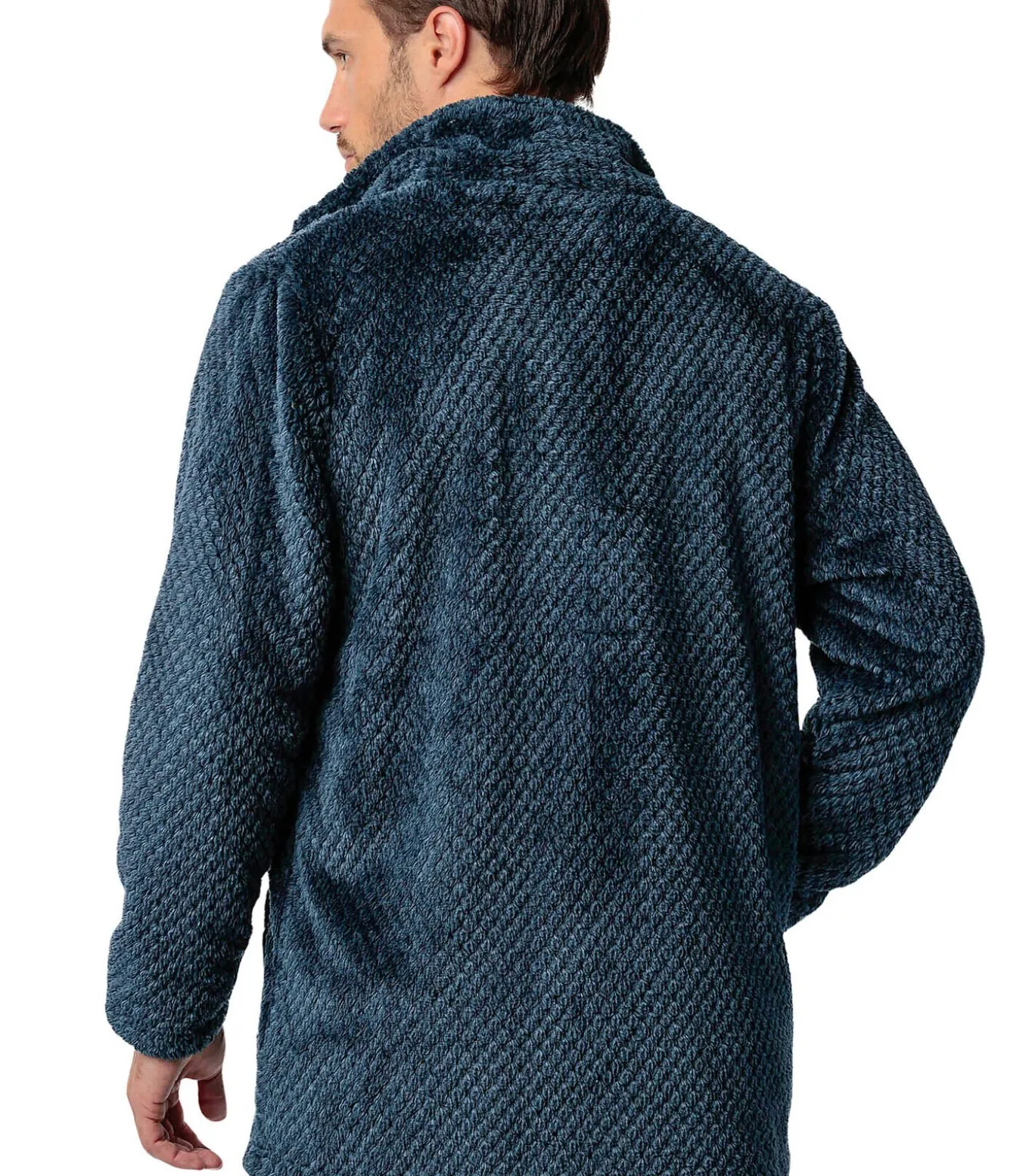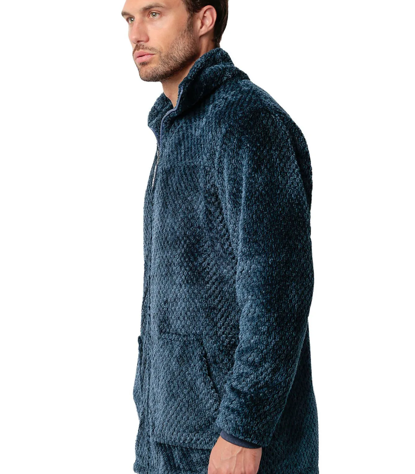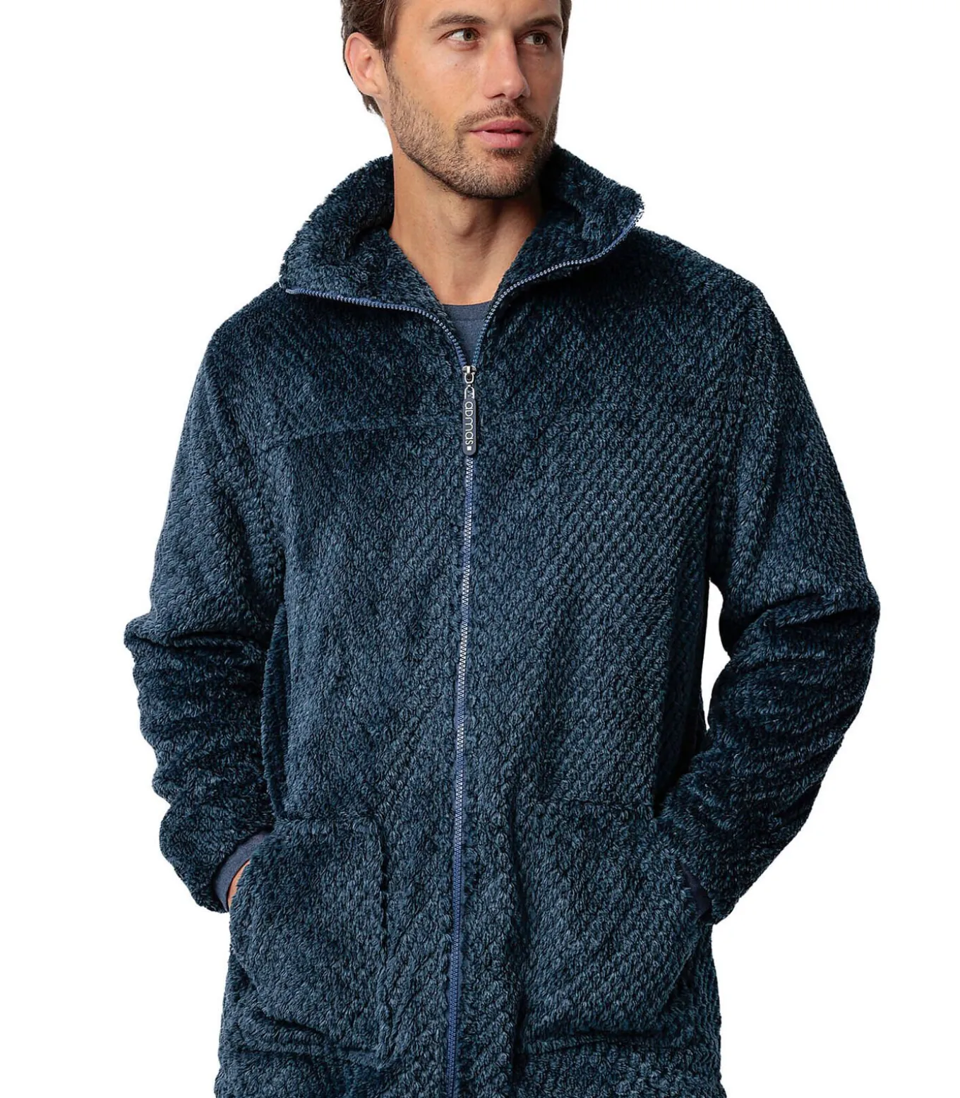 Een warm, zacht en comfortabel binnenjack, ideaal voor de winter of gewoon om thuis te relaxen. De getextureerde Corel fleece stof voelt zacht aan. Het heeft een ritssluiting aan de voorkant, zodat je de warmte gemakkelijk kunt aanpassen of snel kunt aantrekken. Aan de voorkant zitten twee grote opgestikte zakken om je handen warm te houden of om kleine spullen in op te bergen. Hoge kraag met goede bedekking, perfect om je zonder sjaal tegen de kou te beschermen. Lange mouwen met een eenvoudige afwerking. Ultrazacht en zeer comfortabel om te dragen. Dankzij het sobere, elegante ontwerp past deze jas gemakkelijk bij een pyjama of binnenbroek. Perfect om te dragen als loungejack of cocooning overjas op kille dagen. Ideaal voor mannen die warm willen blijven en toch een moderne, verfijnde stijl willen behouden, zonder aan comfort in te boeten. Geleverd in een Admas doos.[Jasje wordt apart verkocht. De pyjama en andere accessoires die het model op de foto’s draagt, zijn niet inbegrepen].