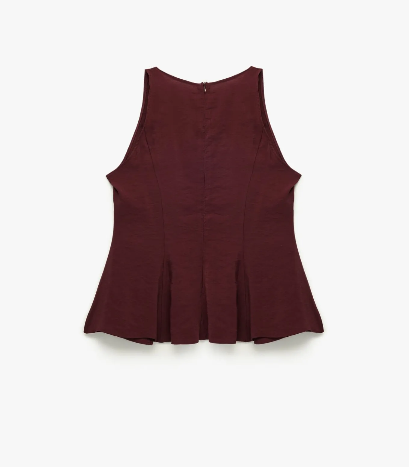 Deze elegante bordeauxkleurige blouse met peplum accentueert je figuur dankzij de slanke pasvorm. Het mouwloze ontwerp en de ronde hals zorgen voor een moderne uitstraling. Gemaakt van modal, biedt deze blouse lichtheid en een zachte textuur, ideaal voor zowel dagelijks gebruik als op kantoor. Combineer met hoge taille jeans en hakken voor een verfijnde look, of draag het met een blazer naar werkafspraken.