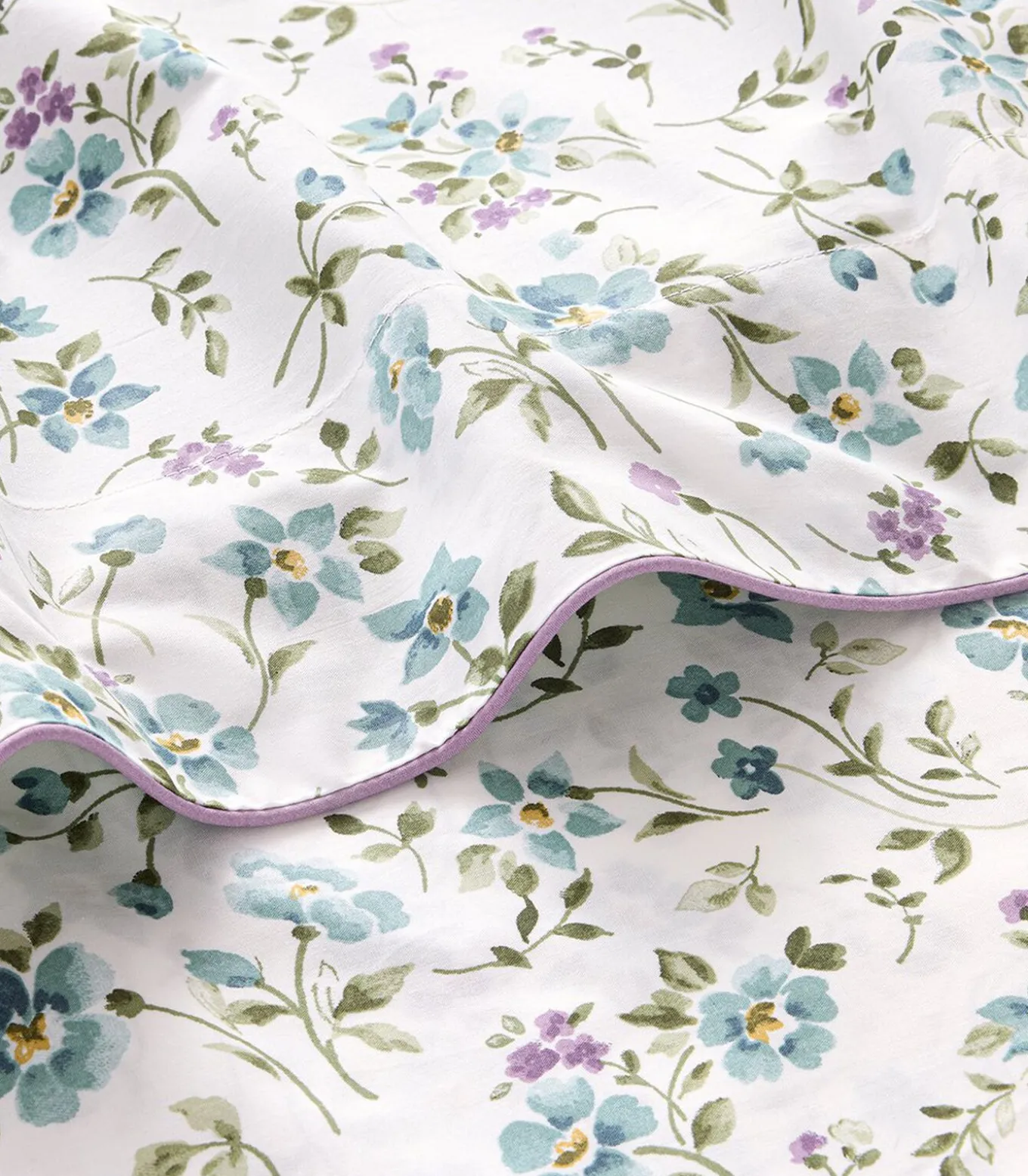 Print van viooltjes in blauwtinten en paars op ivoorkleurige achtergrond