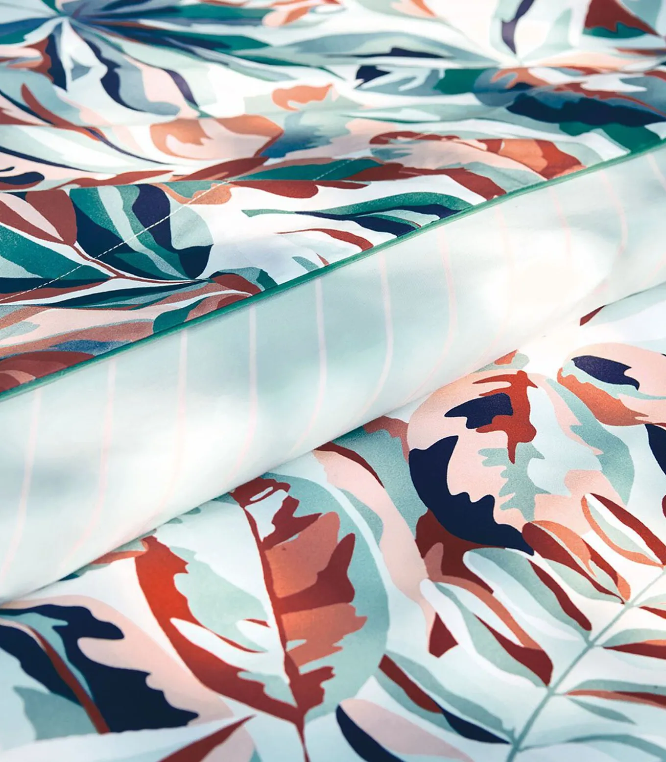 Meerkleurige exotische bladerenprintBies van 8 cm.Afwerking met groene bies.