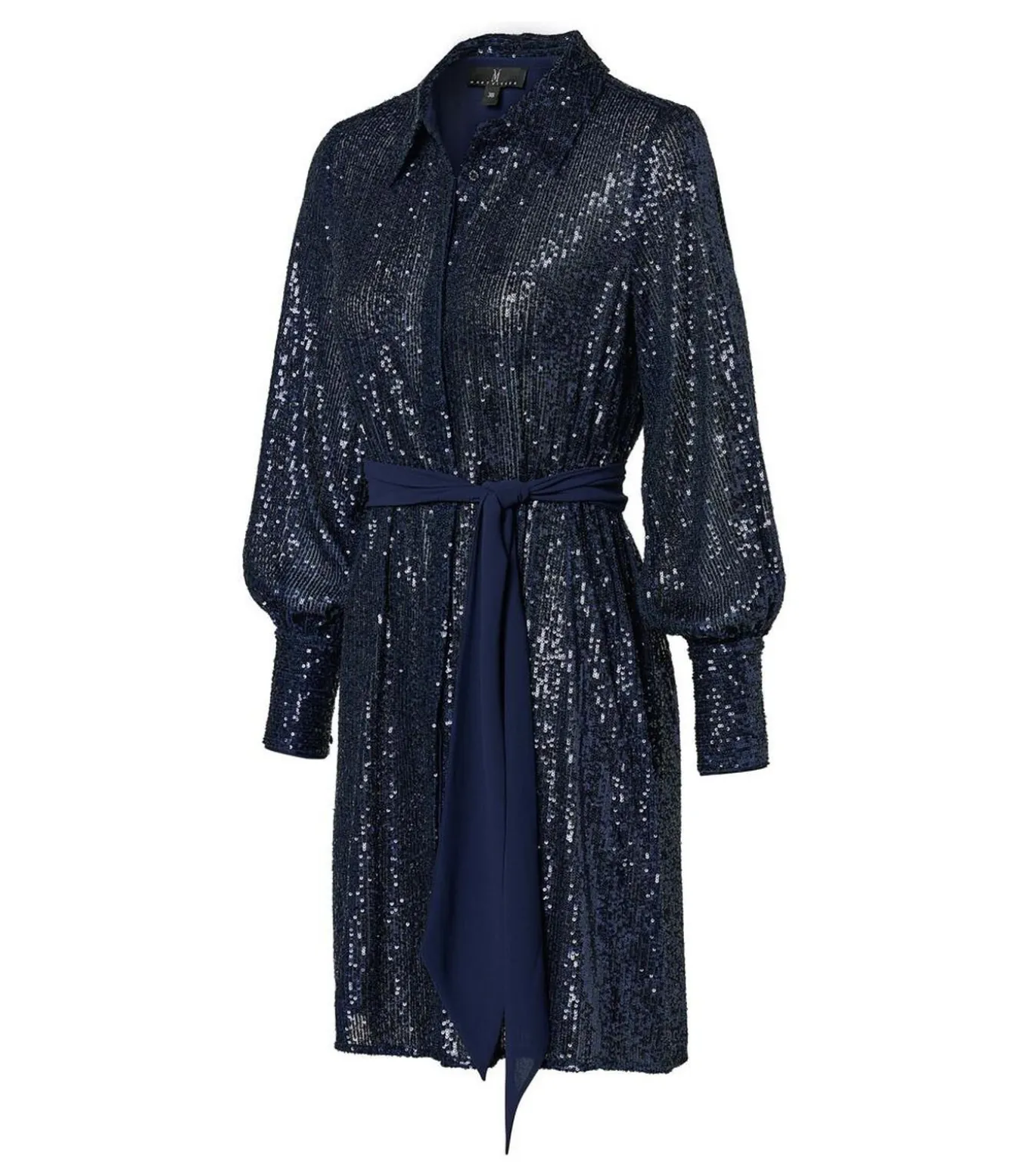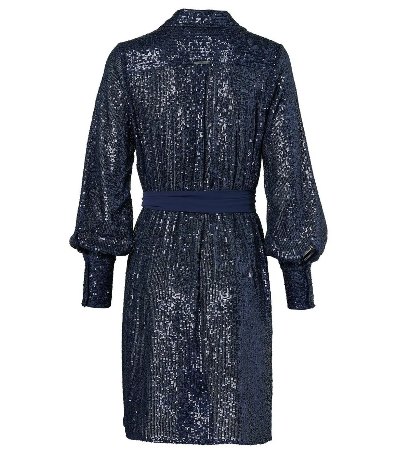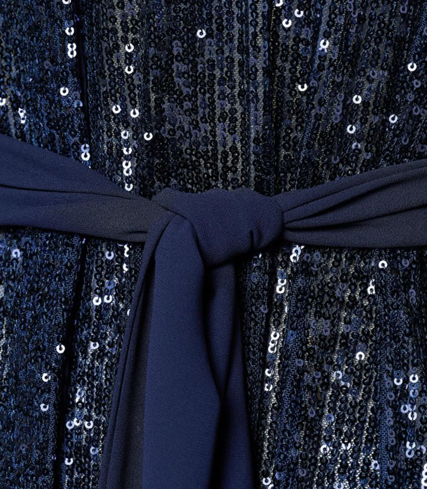 Maak een stijlvolle indruk met de navy pailletten tuniek, een ontwerp dat luxe en draaggemak samenbrengt. Het knielange model is rijkelijk versierd met glinsterende donkerblauwe pailletten die prachtig fonkelen op een diepe blauwtonige basis. De soepele pasvorm zorgt voor een elegante, comfortabele uitstraling. De taille kan verfijnd worden geaccentueerd met een donkerblauw strikceintuur in contrasterende stof, dat gemakkelijk verwijderd kan worden voor een meer ontspannen look. De lange mouwen met aangesloten manchetten en een licht pofeffect geven de tuniek een moderne, vrouwelijke twist. De blinde knoopsluiting en losse slip–onderjurk zorgen voor extra draagcomfort. Met zijn subtiele glans en knielange lengte is dit een veelzijdig kledingstuk dat perfect past bij chique diners, feestelijke gelegenheden en avondelijke events.