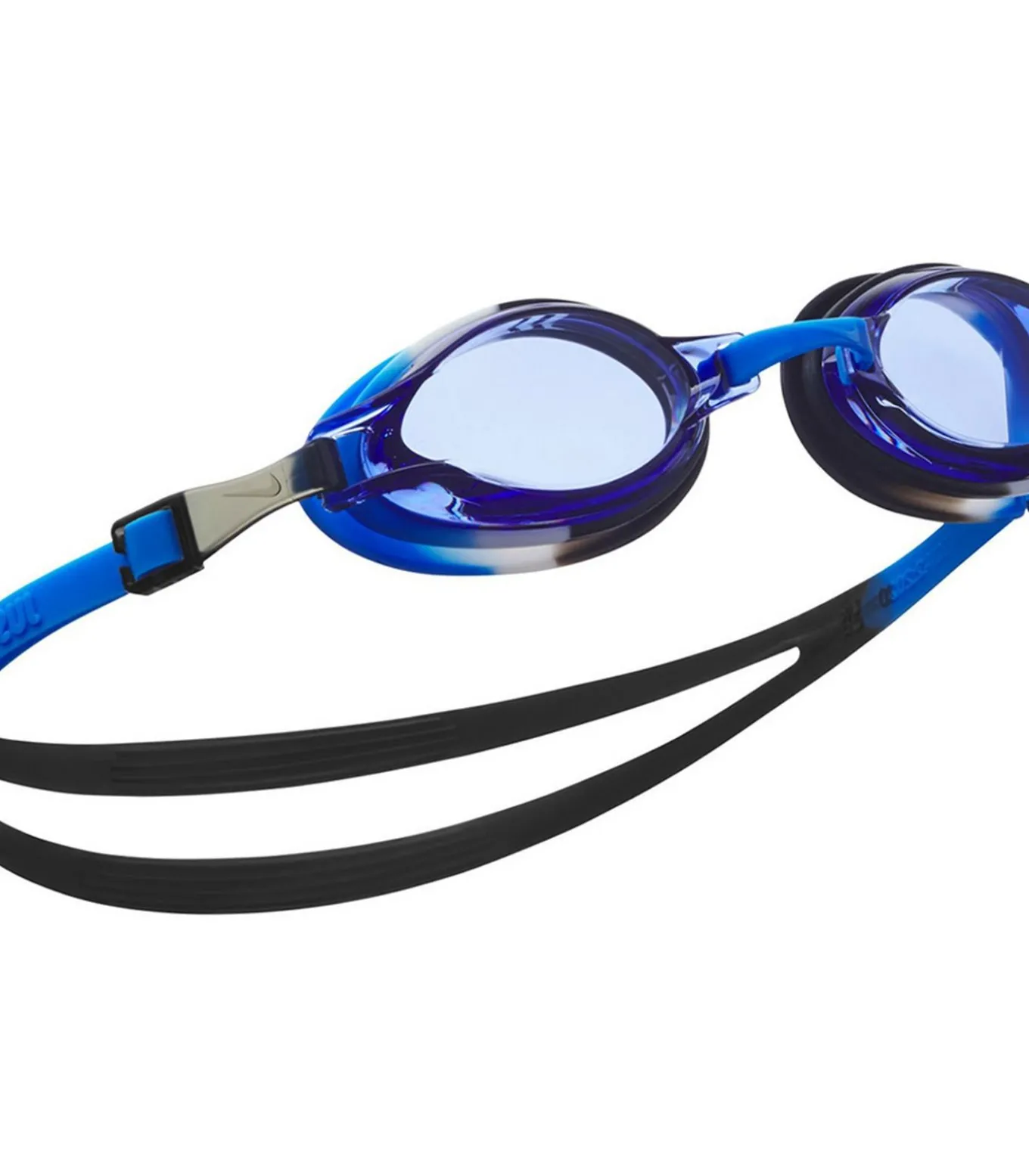Nike zwembril Chromatik – Lichtblauw: Deze schone zwembril van de merk Nike is ontworpen met een stijlvolle combinatie van chroom, Swoosh–embleem en tekst. De bril kan in zes richtingen worden verbogen, inclusief een verbare neusbrug, anti–condensatie en een silicone hoofdband. Verder beschikt deze zwembril over splitband en UV–bescherming. Deze zwembril is geschikt voor kinderen van 8 tot 14 jaar.