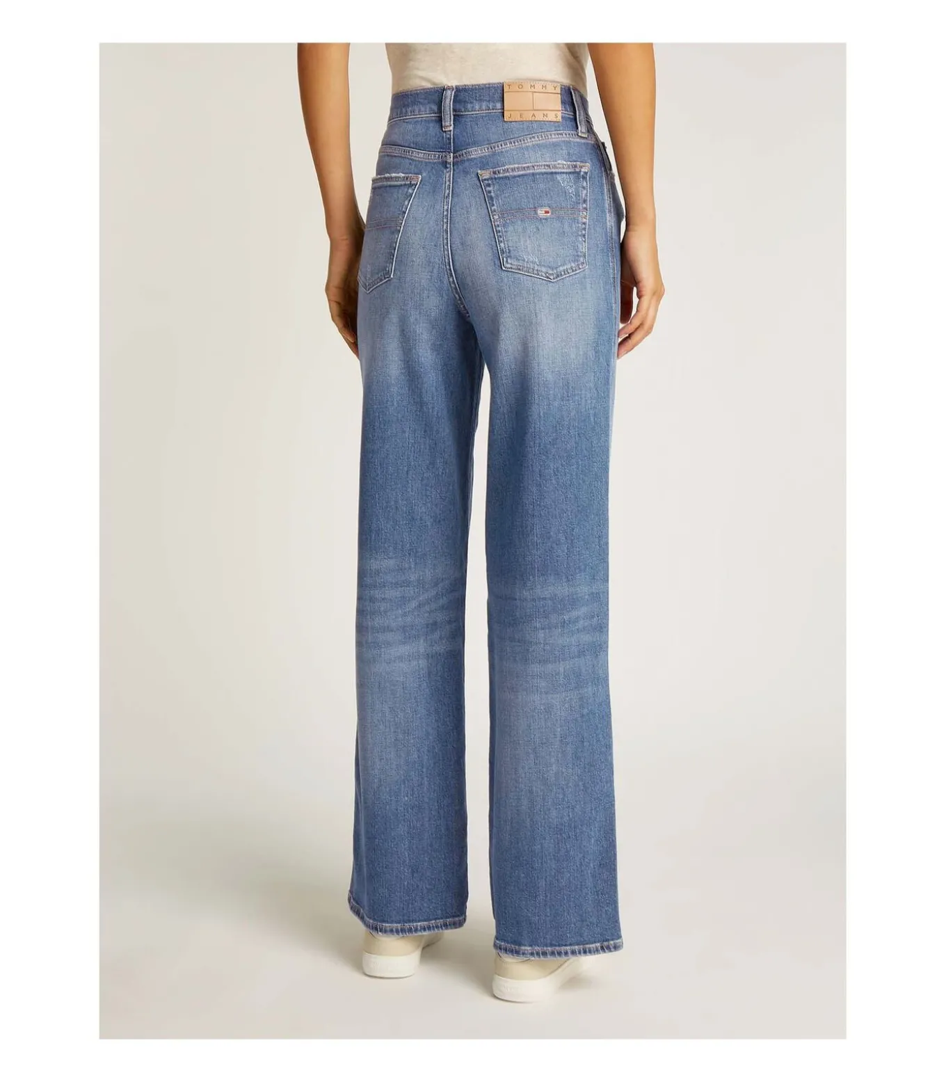 * Kleur: Dark Denim * Samenstelling: 50% geregenereerd katoen, 30% gerecycled katoen, 19% katoen, 1% elastaan * Pasvorm: Wijde pijp * Sluiting: Knoop * Details: Hoge taille, vervaagd effect, Tommy Jeans–logo op de achterzak * Gebruik: Wijde en comfortabele jeans, ideaal voor een eigentijdse casual look met een vintage touch.