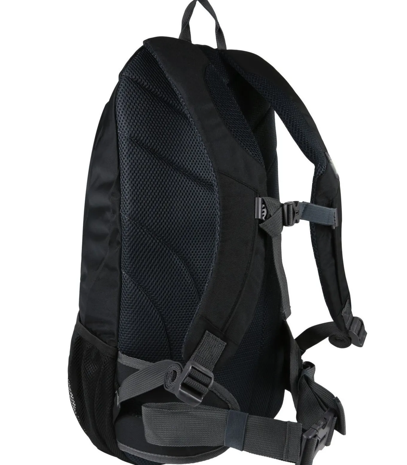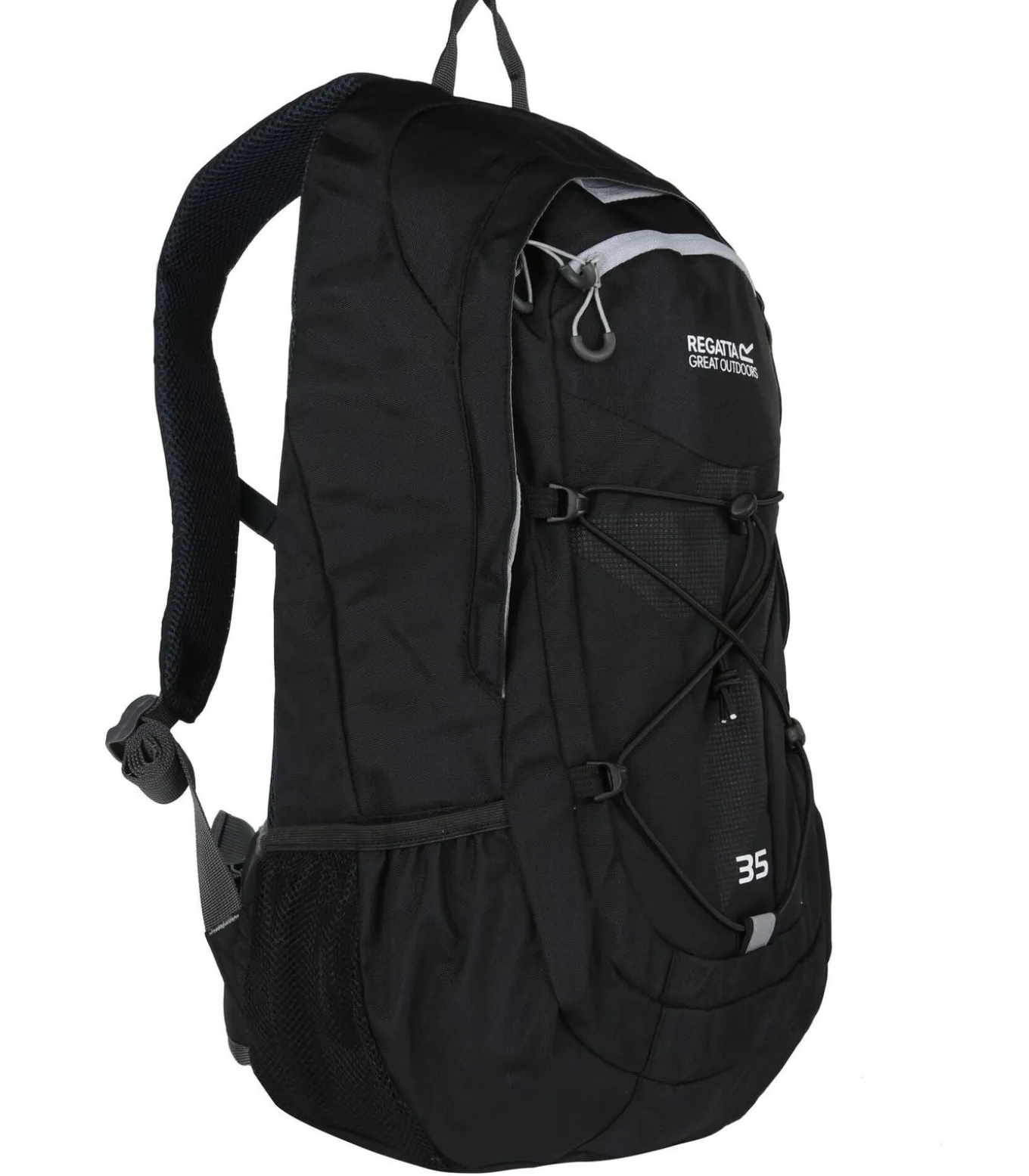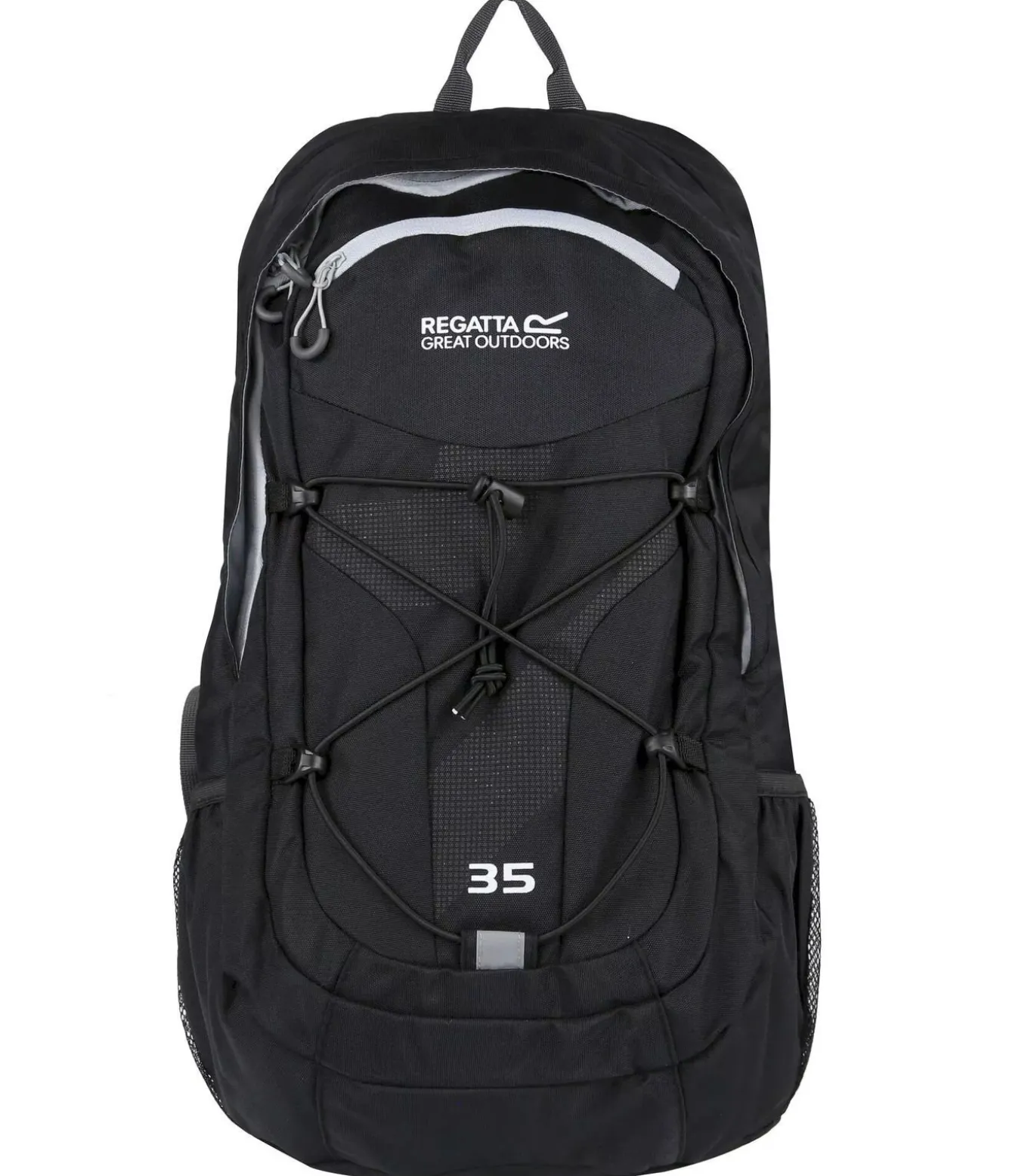 Deze 35–liter rugzak van Regatta heeft een duurzame constructie en comfortabele draagmogelijkheden die zeer geschikt zijn voor meerdaagse excursies. De buitenkant is gemaakt van slijtvast 600D polyester, terwijl het rugpaneel is voorzien van luchtdoorlatend mesh–materiaal om de drager koel en geventileerd te houden tijdens inspannende activiteiten. Een gedempte heupgordel van luchtgaas kan stevig worden vastgemaakt en heeft verstelbare schuifjes voor een aangepaste pasvorm. Het borstharnas heeft ook verstelbare schuifjes voor een ideale gewichtsverdeling. Extra opbergruimte wordt geboden door een elastisch bungeekoord aan de voorkant. De ritstrekkers zijn oversized zodat je ze ook met handschoenen kunt vastpakken. Een externe zak met rits biedt snel toegankelijke opbergruimte, terwijl interne zakken kleinere essentiële items zoals sleutels of elektronica opbergen. In de zijzakken van gaas passen standaard waterflessen. Reflecterende bekleding verbetert de zichtbaarheid bij weinig licht voor meer veiligheid. Kortom, een veelzijdige en comfortabele transportoplossing.