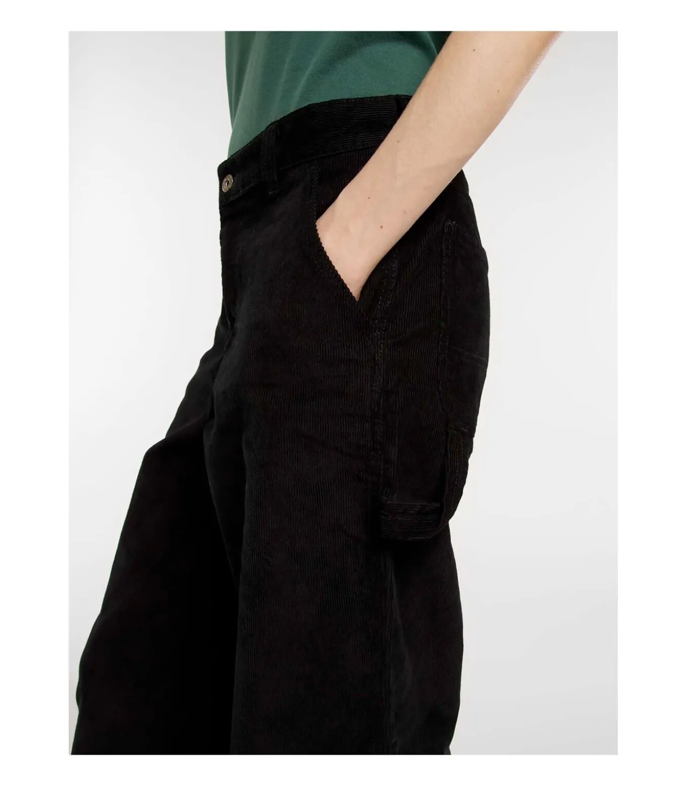 Kleur: zwart. Samenstelling: 99% katoen, 1% elastaan. Pasvorm: losvallend. Details: gemaakt van zacht stretch corduroy, lage taille, schuine zakken, twee gereedschapszakken, hamerlus, 6 riemlussen. Gebruik: ideaal voor een casual stijl met praktische werkkleding en maximale bewegingsvrijheid.