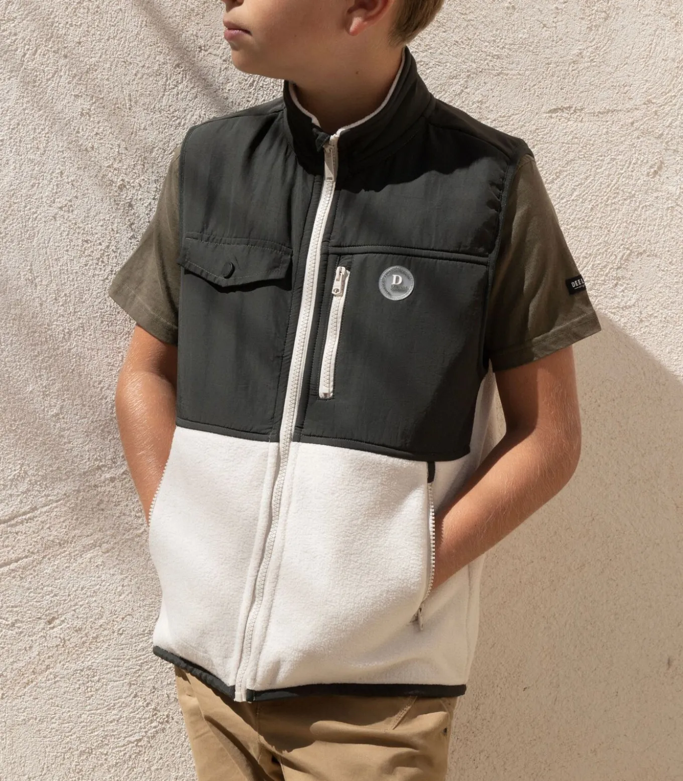 Mouwloze jas voor jongens van CRUMB. Deze casual jas heeft een rechte pasvorm met opstaande kraag en ritssluiting. Hij is gemaakt van fleece–achtig materiaal en valt op door de contrasterende inzetstukken op de borst en schouders. Hij heeft drie zakken aan de voorkant: een borstzak met drukknoopsluiting, een borstzak met verticale ritssluiting en twee zijzakken. Rond logo op de linkerborst. Een stijlvol en comfortabel model om over een sweater of T–shirt te dragen.