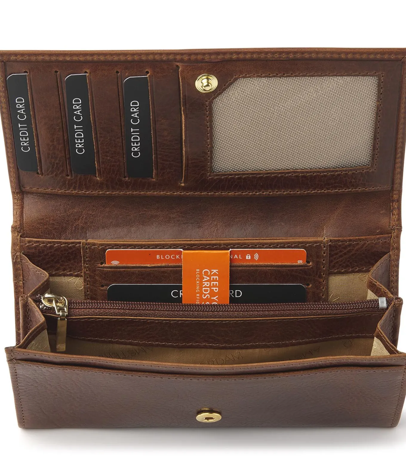 Deze klassieke damesportemonnee is gemaakt van rundleder. Het is een ruime portemonnee met plaats van acht creditcards en een extra creditcard of fotovak met gaas. De portemonnee wordt afgesloten met een drukknop, heeft twee vakken voor papiergeld, drie steekvakken en een ritsvakje. De achterzijde heeft een steekvak en een ritsvak. De portemonnee beschikt over RFID bescherming.
