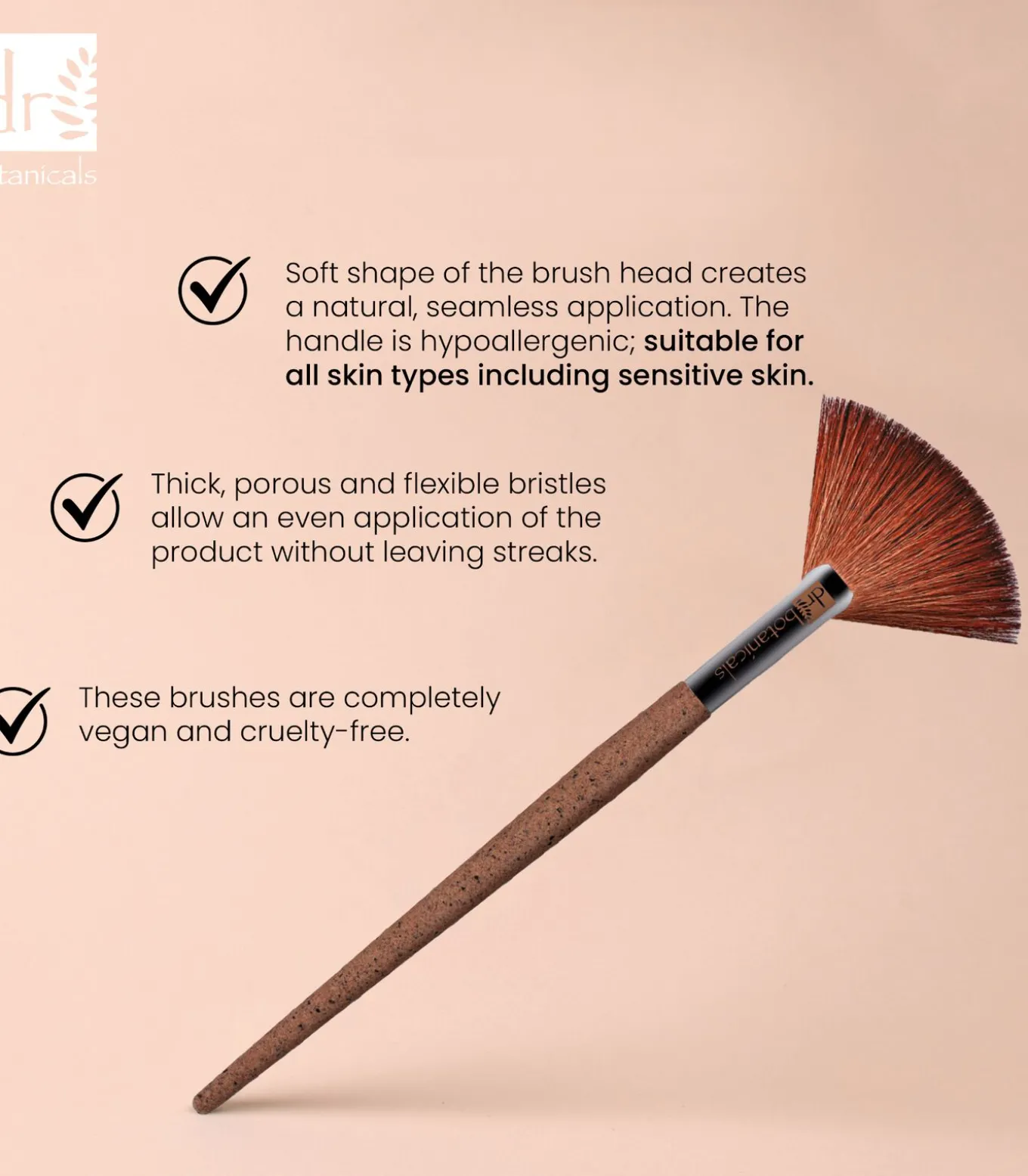 Laat je meest vlekkeloze eindresultaat zien met deze fluweelzachte synthetische vezels, ideaal voor gebruik als laatste stap in je routine om een streak–free, blended afwerking te bieden. Voeg de laatste details aan je look toe met deze kwast, ontworpen voor flexibele applicatie. Wij zijn er zeker van dat dit je nieuwe must–have in je make–up tas zal worden.Over de collectie:Bij make–up kun je je tools zeker de schuld geven als de applicatie niet vlekkeloos is. Dr Botanicals heeft prachtig natuurlijke, strakke en effectieve make–upkwasten ontworpen voor een professionele applicatie.Voel je zelfverzekerd in je look, wetende dat je make–up is aangebracht met fluffy bionische vezels die de zachte textuur van natuurlijk haar nabootsen. De biologisch afbreekbare handvatten zijn volledig gemaakt van koffiedik en maïszetmeel, en de verpakking is afkomstig van gerecycled papier.