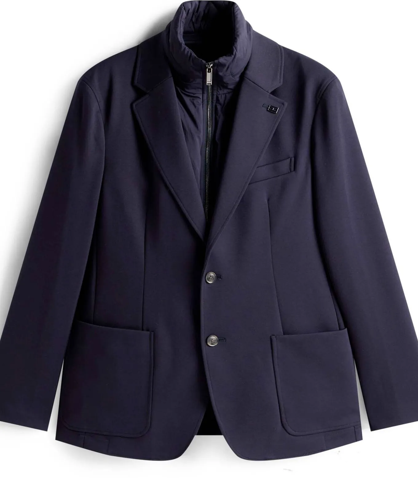 Kleur: Desert Sky. Samenstelling: 75% gerecycled polyester, 22% duurzame viscose, 3% elastaan. Pasvorm: Regular. Sluiting: Twee knopen aan de voorkant. Details: Performance–collectie; enkelrijs blazer met inkepingen in de revers en metalen logospeld; uitneembare gewatteerde inzet met hoge kraag en rits; paspelzak op de borst; opgestikte zakken aan de voorkant; split aan de achterkant. Duurzaamheid: Gemaakt van gerecycled polyester en duurzame viscose. Gebruik: Perfect om gemakkelijk van formeel naar smart–casual te gaan, met behoud van comfort en stijl.