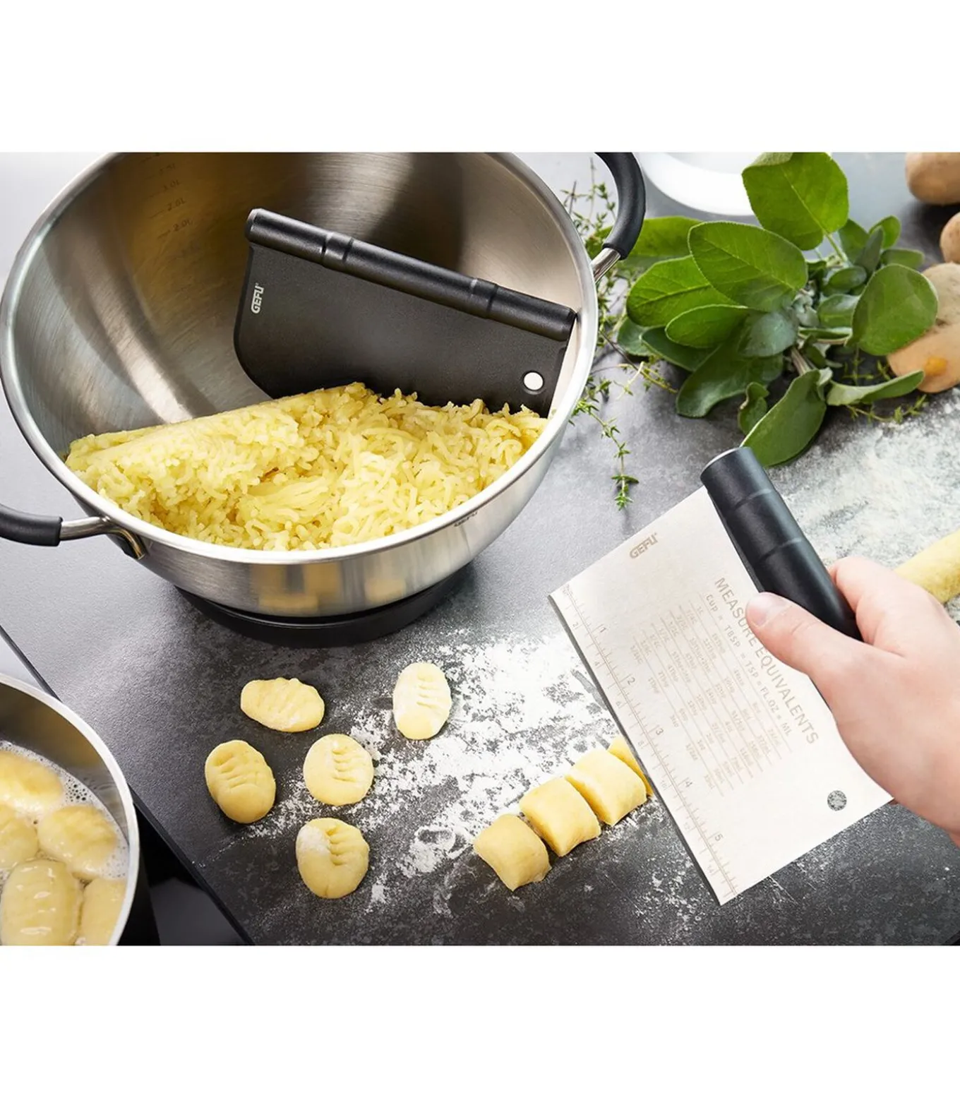 • deegsnijderset, plaatsbesparend in elkaar te zetten • hoogwaardige roestvrijstalen deegsnijder met meetschaal (cm / inch) en omrekentabel (Cup = TBSP = TSP = FL.OZ = ML)• ergonomisch gevormde kunststof–deegschraper