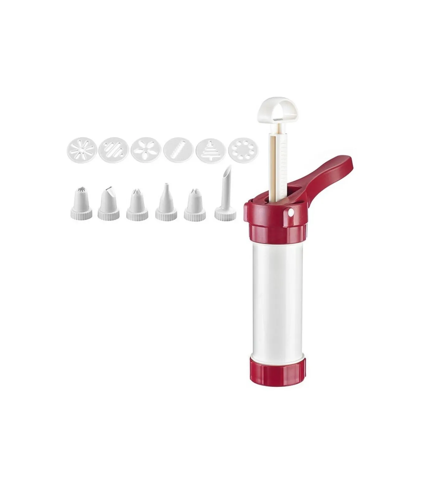 Deze deegspuit is perfect voor het maken van koekjes. Je krijgt er 6 verschillende mondstukken, 6 verschillende schijfjes en een adapter bij. Ideaal voor kinderen dus! Door het handige bedieningsmechanisme kun je met één hand garneren. De deegspuit heeft een inhoud van 22.5 cl en is vaatwasserbestendig.