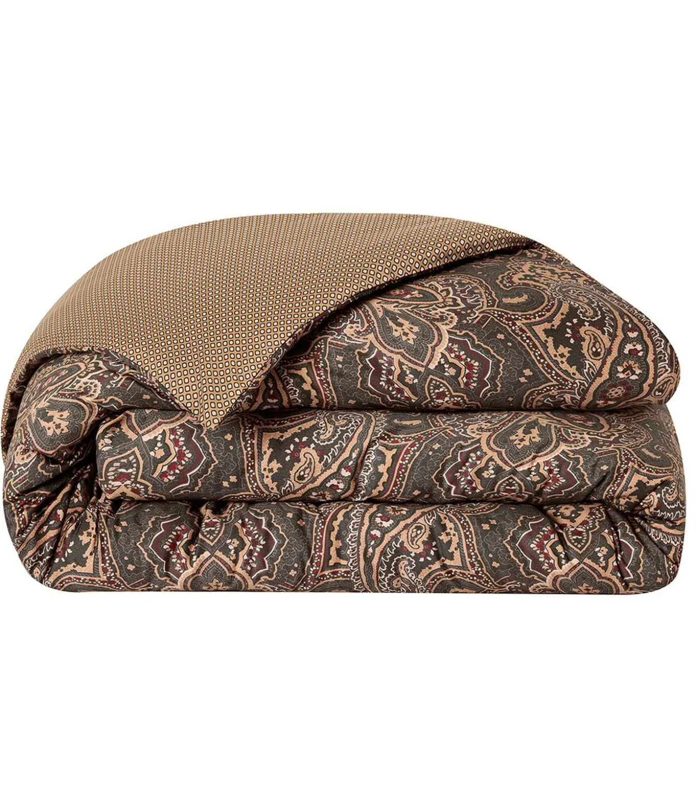Print met paisleymotief in okertinten en engels groenPrint met stropdasmotief in okerkleuren
