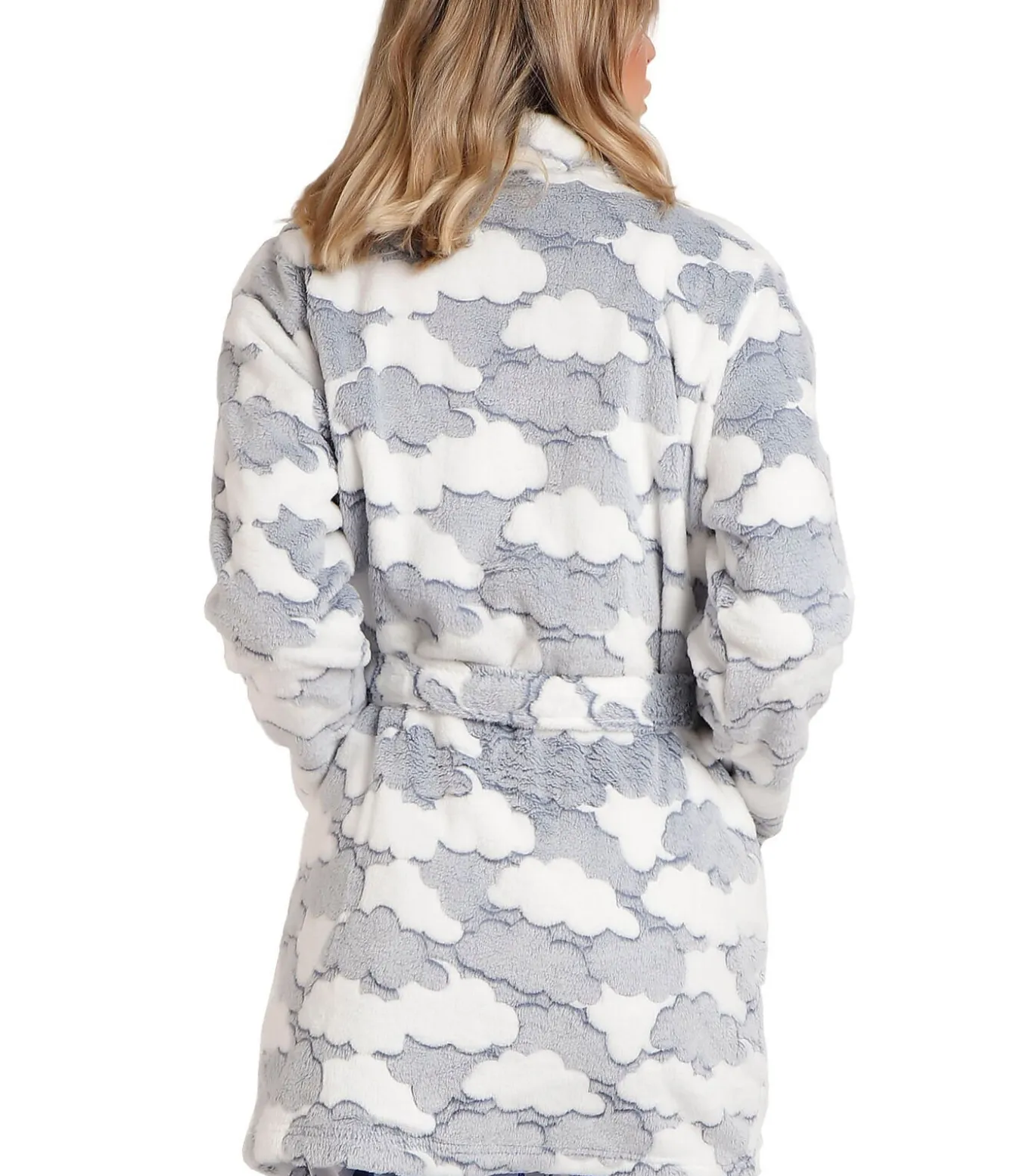 Zeer warme badjas van Corel fleece, met all–over wolkenpatroon. Hij heeft lange mouwen en praktische steekzakken. Hij kan dicht worden gedragen dankzij een ceintuur die in de taille kan worden geknoopt en een knoopsluiting aan de voorkant. Ultrazacht en comfortabel, perfect voor winteravonden of ontspannen dagen thuis.[Jurk wordt apart verkocht. De pyjama die het model op de foto’s draagt, is niet inbegrepen].