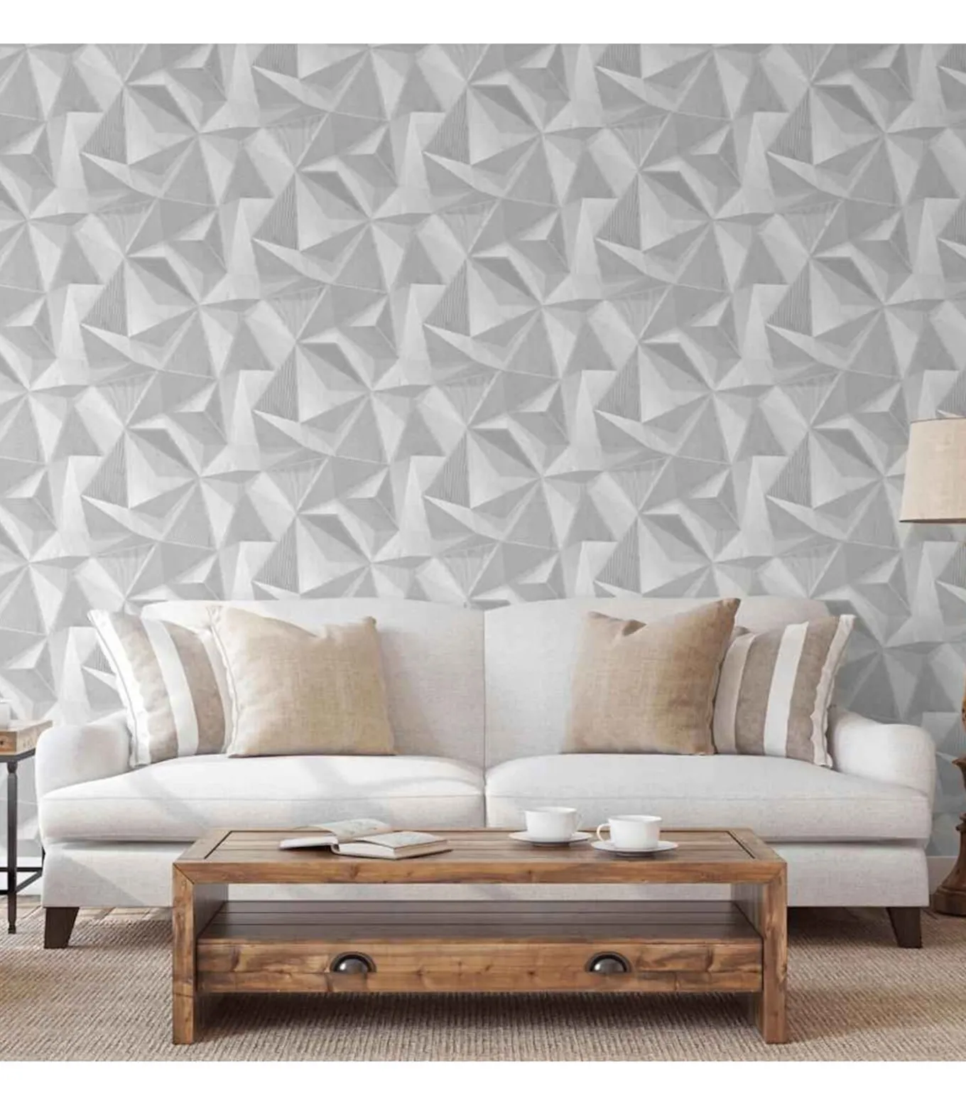 Het duurzame behang heeft geometrisch design met 3D–effect door de verschillende kleurtinten en schaduwen. Het kan droog worden verwijderd zonder je muur te beschadigen.