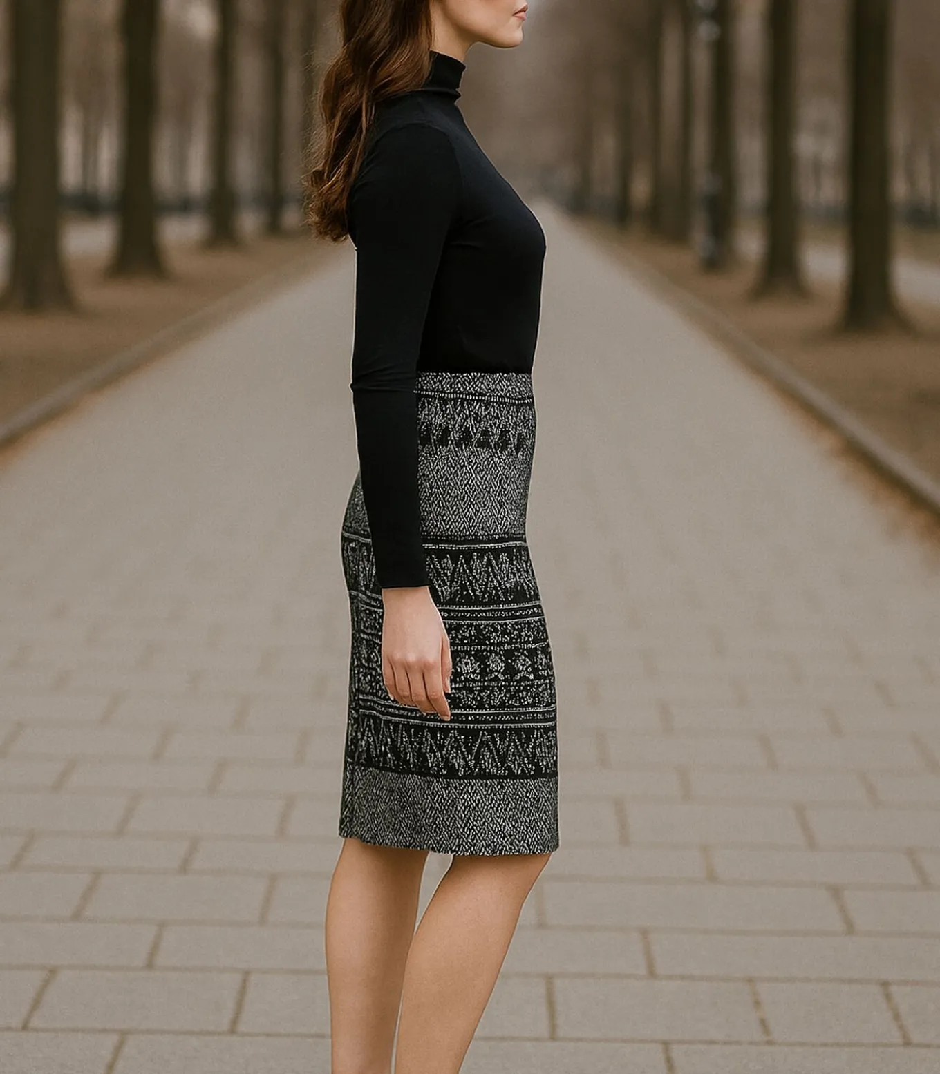 Verfijning ontmoet comfort met deze kokerrok tot onder de knie, gemaakt van hoogwaardige zakar–gabardine–stof. De rok heeft een opvallende luipaardprint, een verborgen ritssluiting aan de achterkant, een kleine split aan de achterkant voor bewegingsvrijheid en een aansluitende voering voor een onberispelijk silhouet. Gemaakt met een stofsamenstelling van 52% polyester, 41% katoen en 7% elastaan, biedt het duurzaamheid, ademend vermogen en stretch voor een comfortabele pasvorm. Deze rok is perfect voor formele en casual gelegenheden en combineert moeiteloos met een klassieke blouse of een strakke top voor een verzorgde en stijlvolle look.