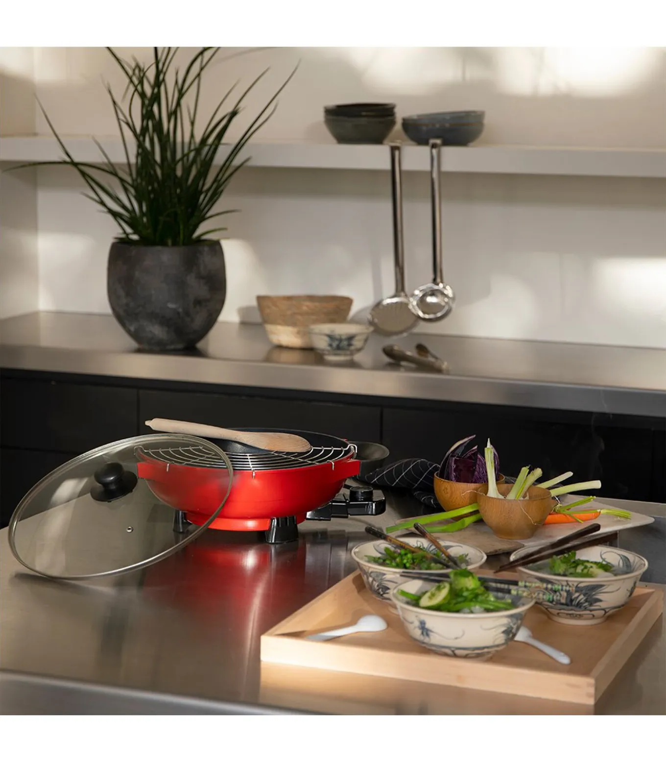 Elektrische wok, Antiaanbaklaag, Inhoud 4 L, Ø 33,5 cm, Instelbare en uitneembare thermostaat, Deksel van gehard glas met stoomopening, Inclusief bamboe spatel en roestvrijstalen halvemaanrooster