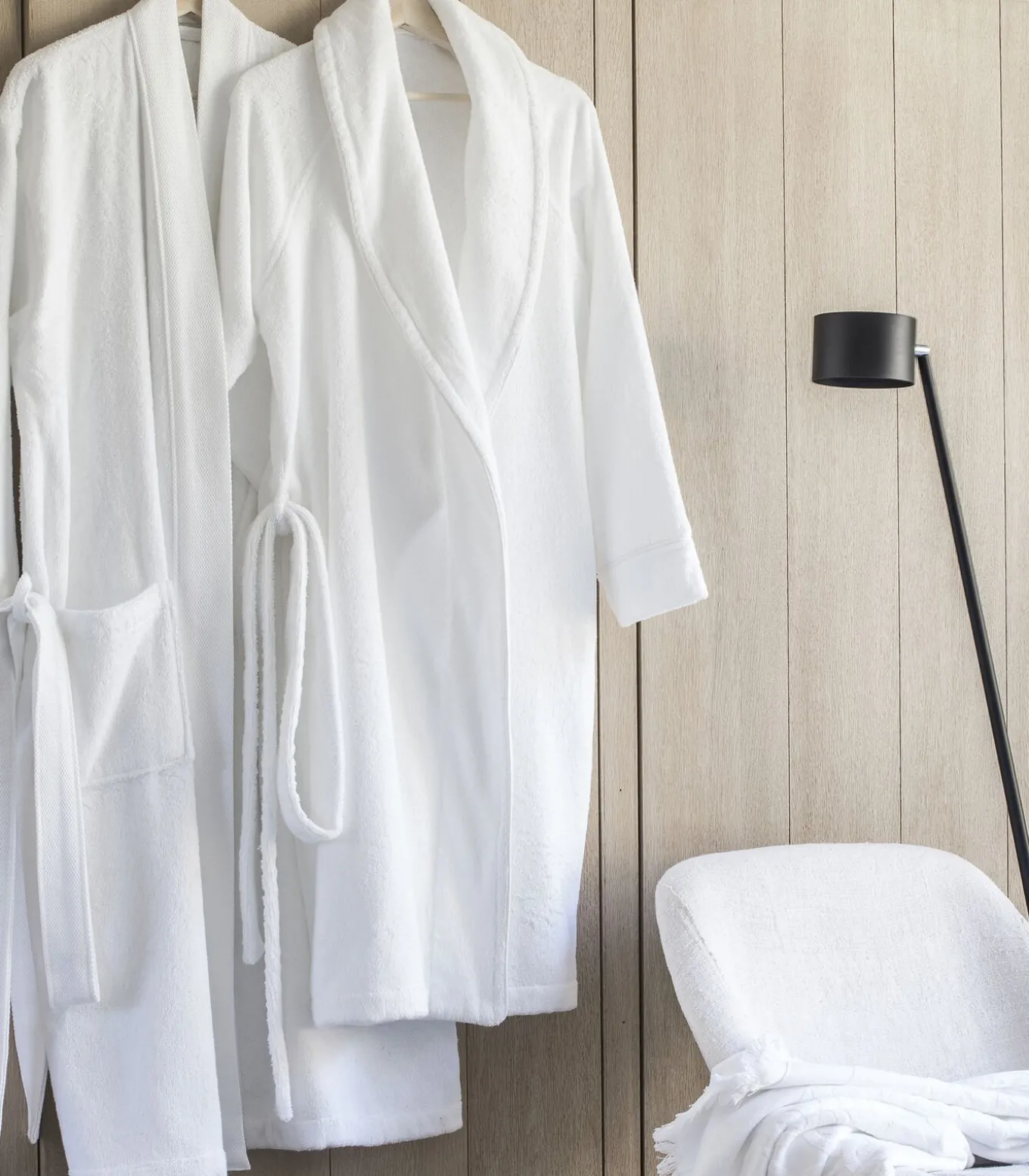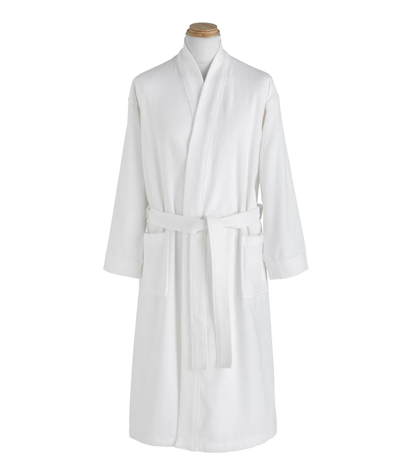 Badjas Ess–Kimo, effen badjas in kimonostijl, gemaakt van gekamd katoen, met een gekeperde boord. Deze effen badjas past uitstekend bij onze badtextielcollectie.